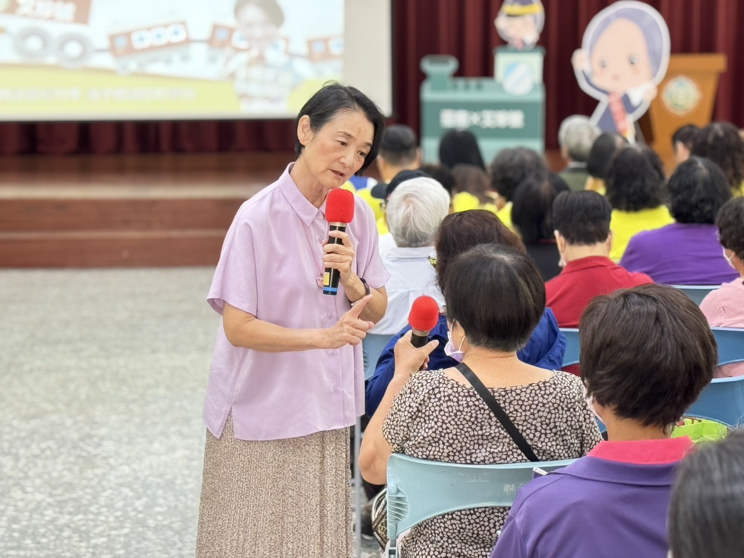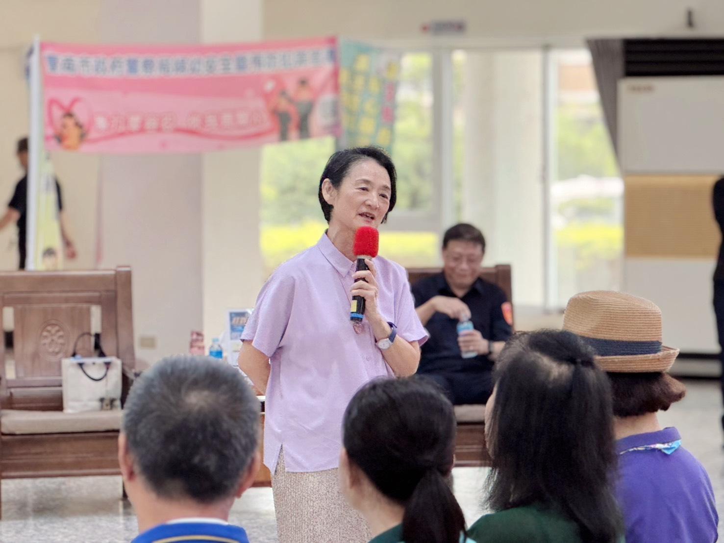 市政府警察局交通警察大隊及市政府法制處分別進行交通安全及消費糾紛詐騙等宣導,緊接譚艾珍女士將自身遭遇假檢警手法詐騙經驗,分享給大家了解,並指出在第2次被騙時,幸運地被警方發現後馬上阻止,避免再次受騙,希望受騙民眾可以勇敢站出來報案,現場民眾聽取譚艾珍被騙過程後,更是有感而發,主動分享先前遭詐騙等情事。