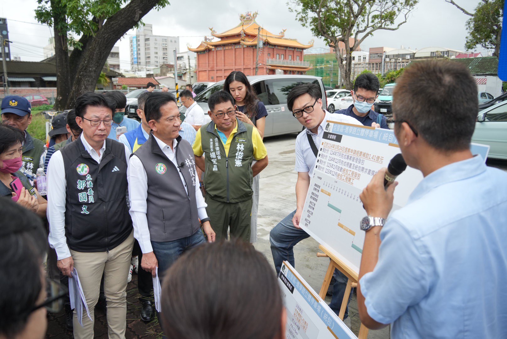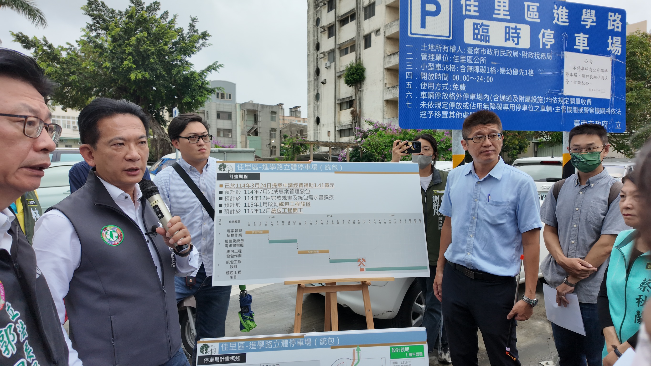 一行人來到佳里考察立體停車場,郭國文指出,進學路有很好的公有地可以使用,希望透過更多停車空間,來減少違規停車與塞車問題。目前規劃興建4層樓的停車場,預計停放144輛汽車,1樓預計導入460坪的空間做為商業使用,預計115年1月啟動統包工程發包,115年12月開始動工,總經費預估3.93億元。
