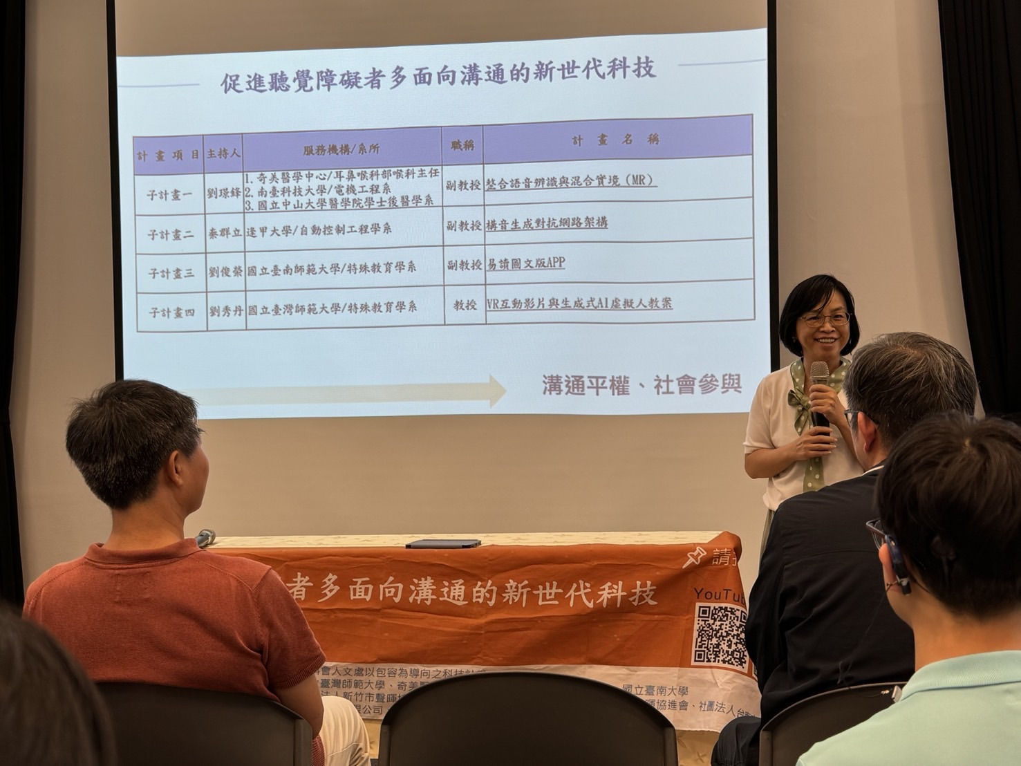 臺師大教授劉秀丹領導的研究團隊,結合人工智慧、語音辨識、易讀通譯與擴增實境等科學技術,研發出智慧眼鏡即時輔助系統、構音轉換應用程式、易讀圖文通譯平台、生成式 AI 溝通互動虛擬人。劉秀丹說:「研發團隊運用科技,致力於提升聽障朋友的日常溝通與文化參與,讓溝通變得更容易,資訊平權落地實現,世界可以更公平」。