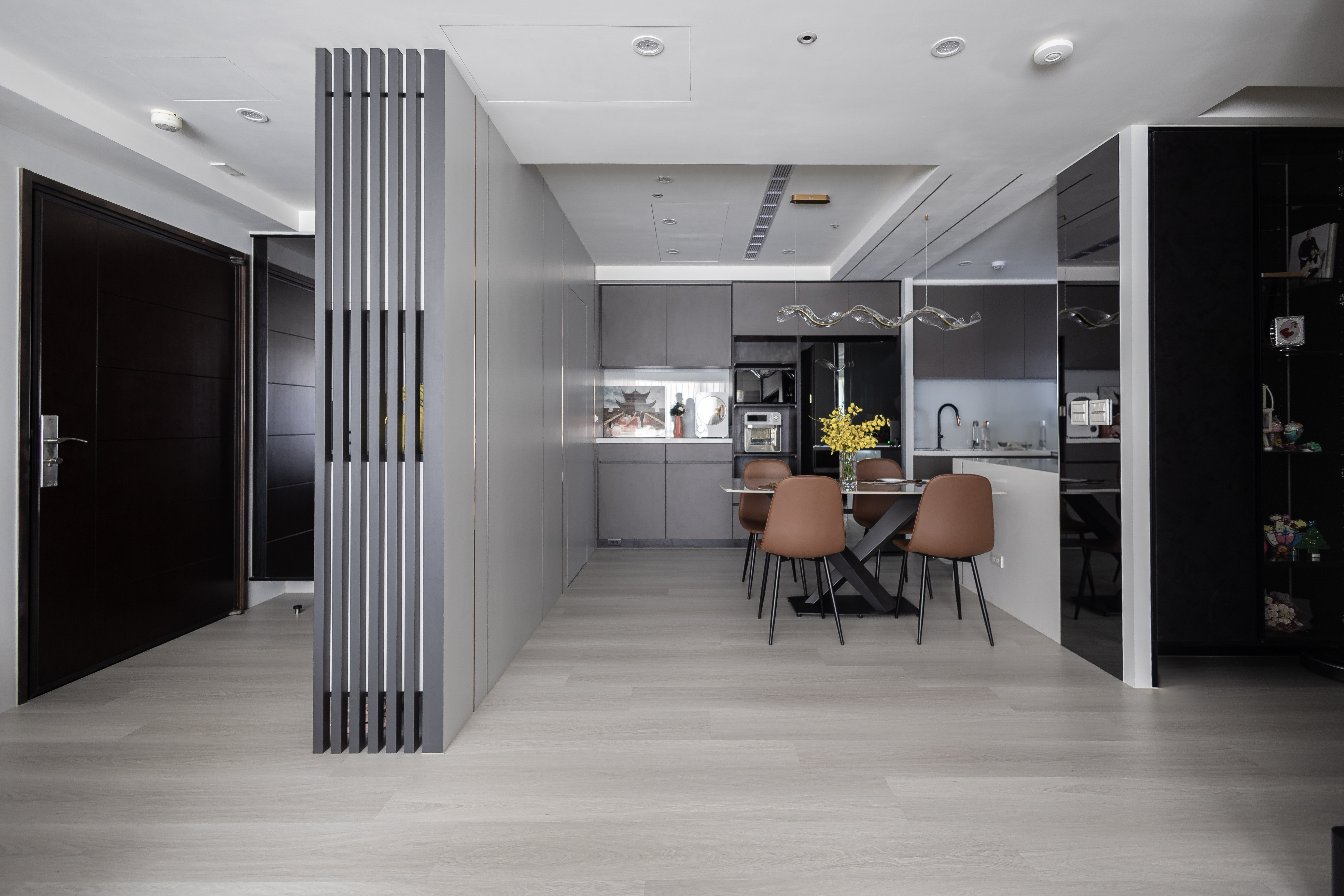 面向餐廚區的背牆,以一抹灰韻細膩鋪敘,並將通往儲藏間的隱藏門整併其中,而精緻入微的金屬飾條,則營造出內斂又奢雅的空間意境。