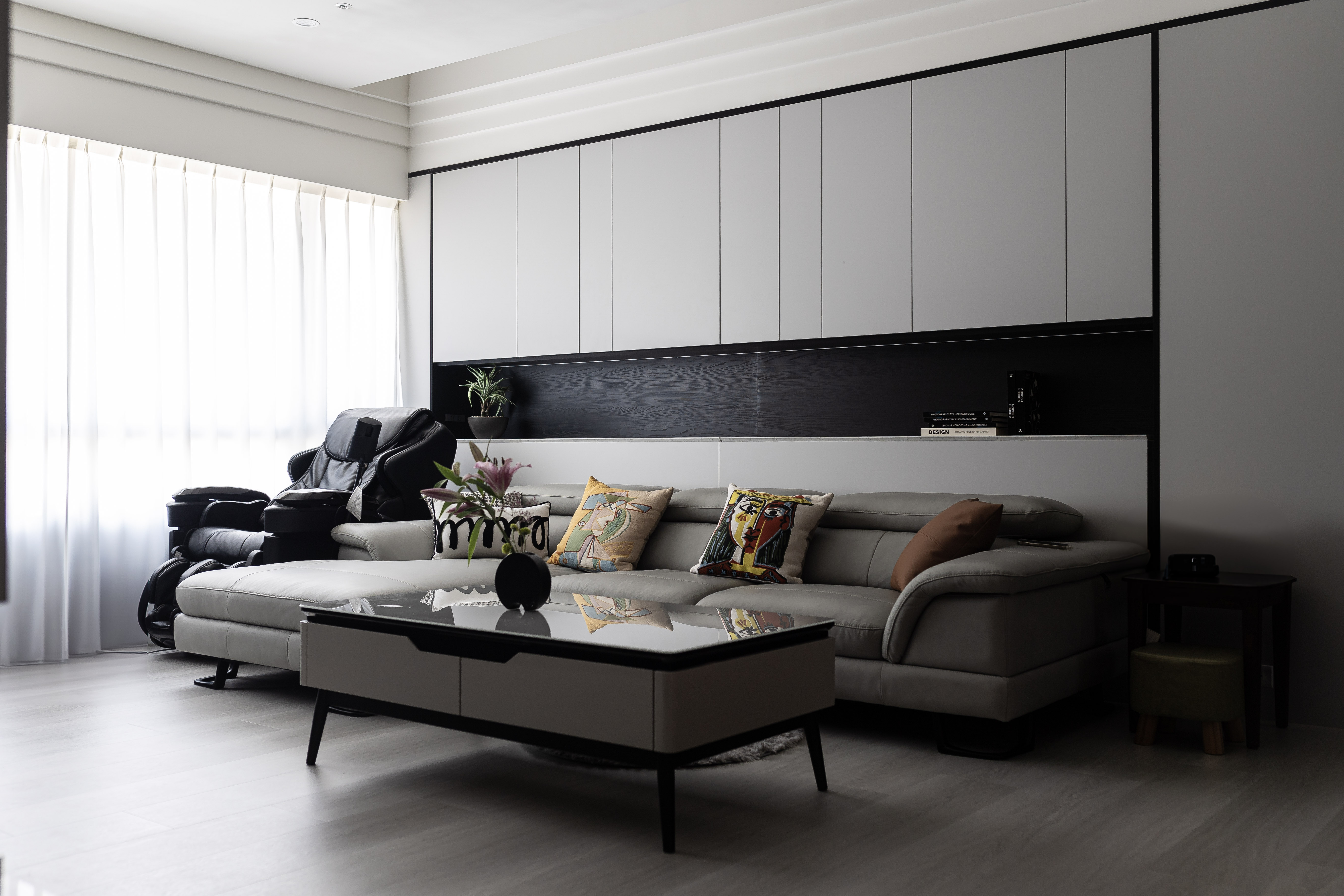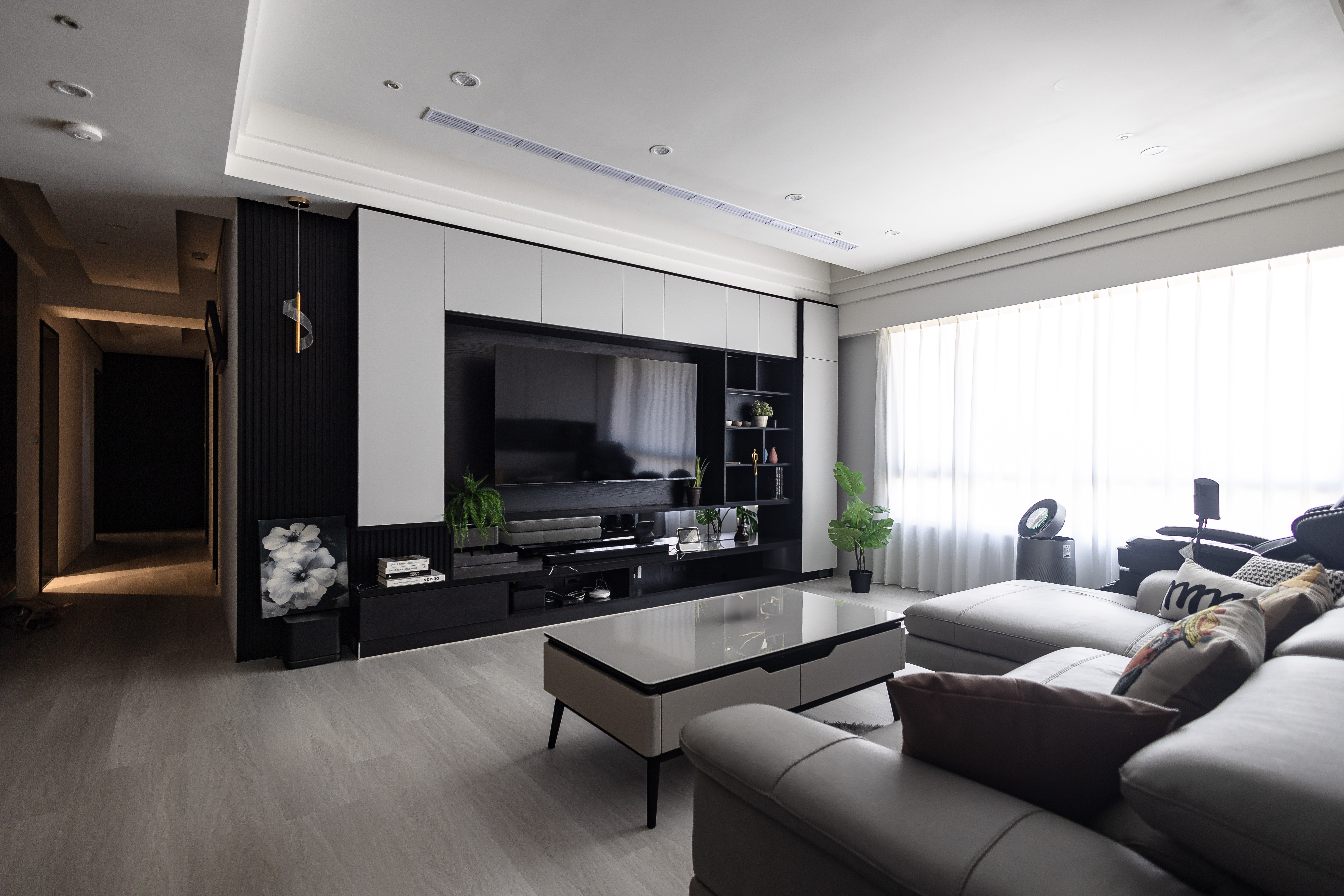 以黑白交織的摩登空間,透過線條、體塊的交疊韻律,建構出一個既現代又充滿藝術氣息的生活場景。電視主牆以理性的拼接手法,串織格柵吊燈端景、黑白展示收納、石紋機櫃、黑鏡材質等不同美學因子,搭配珍藏的藝品擺件,一點一滴生長出居者獨特的審美意識。