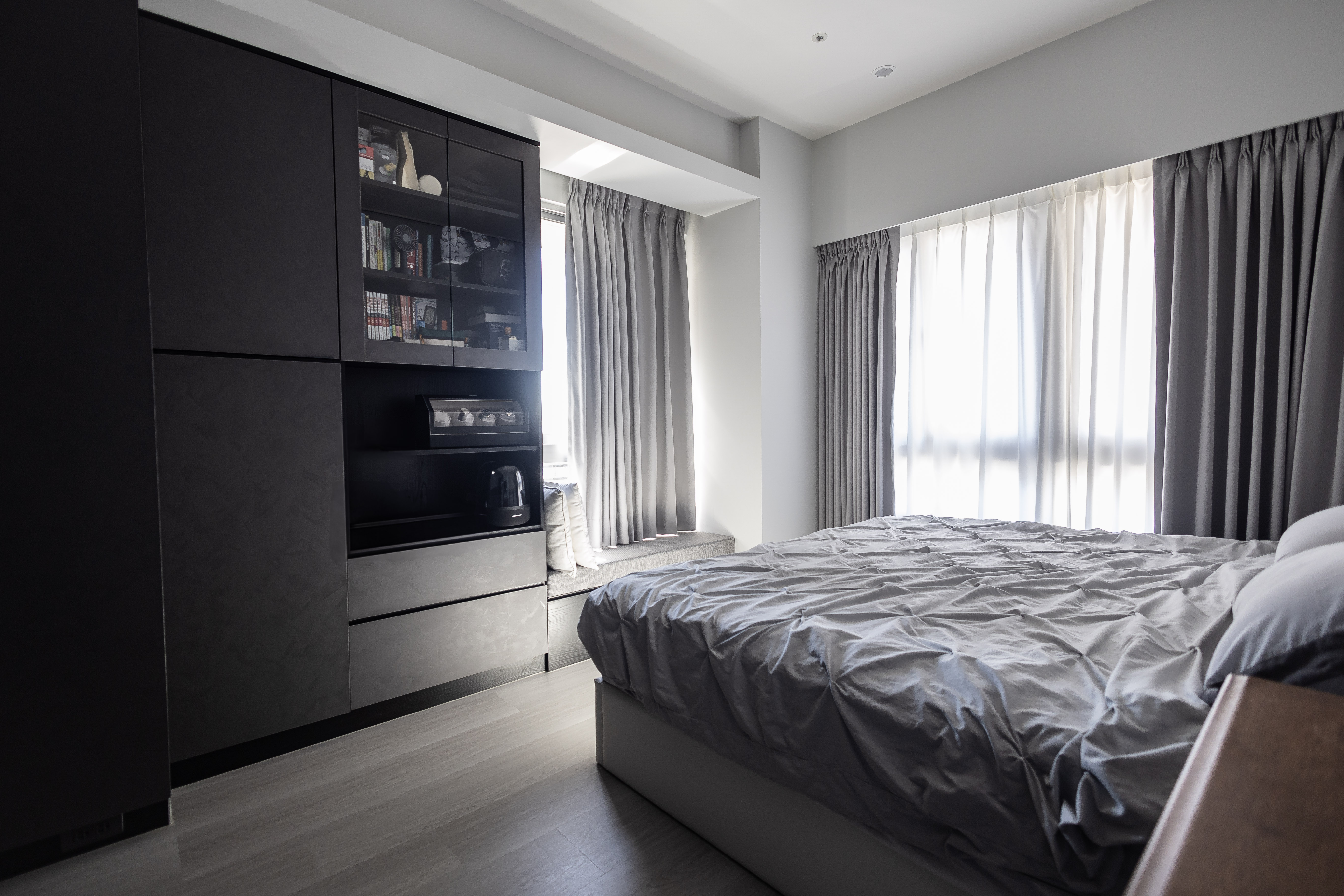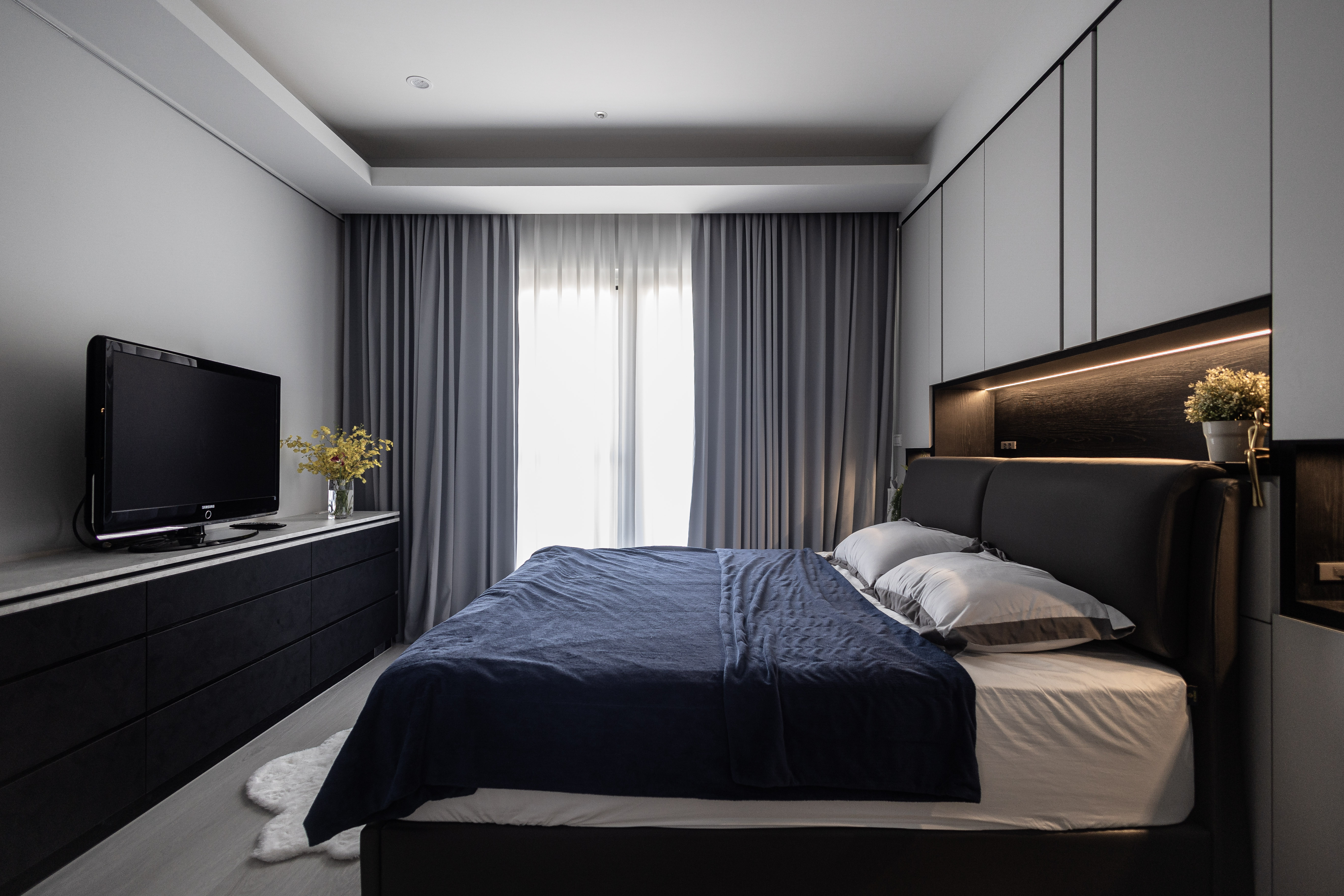 次臥房作為男主人的獨屬之地,設計師巧以穩歛的黑色系,將空間氛圍切換至私密狀態,讓居者能專注於自我,感受源於空間的純粹與自由。