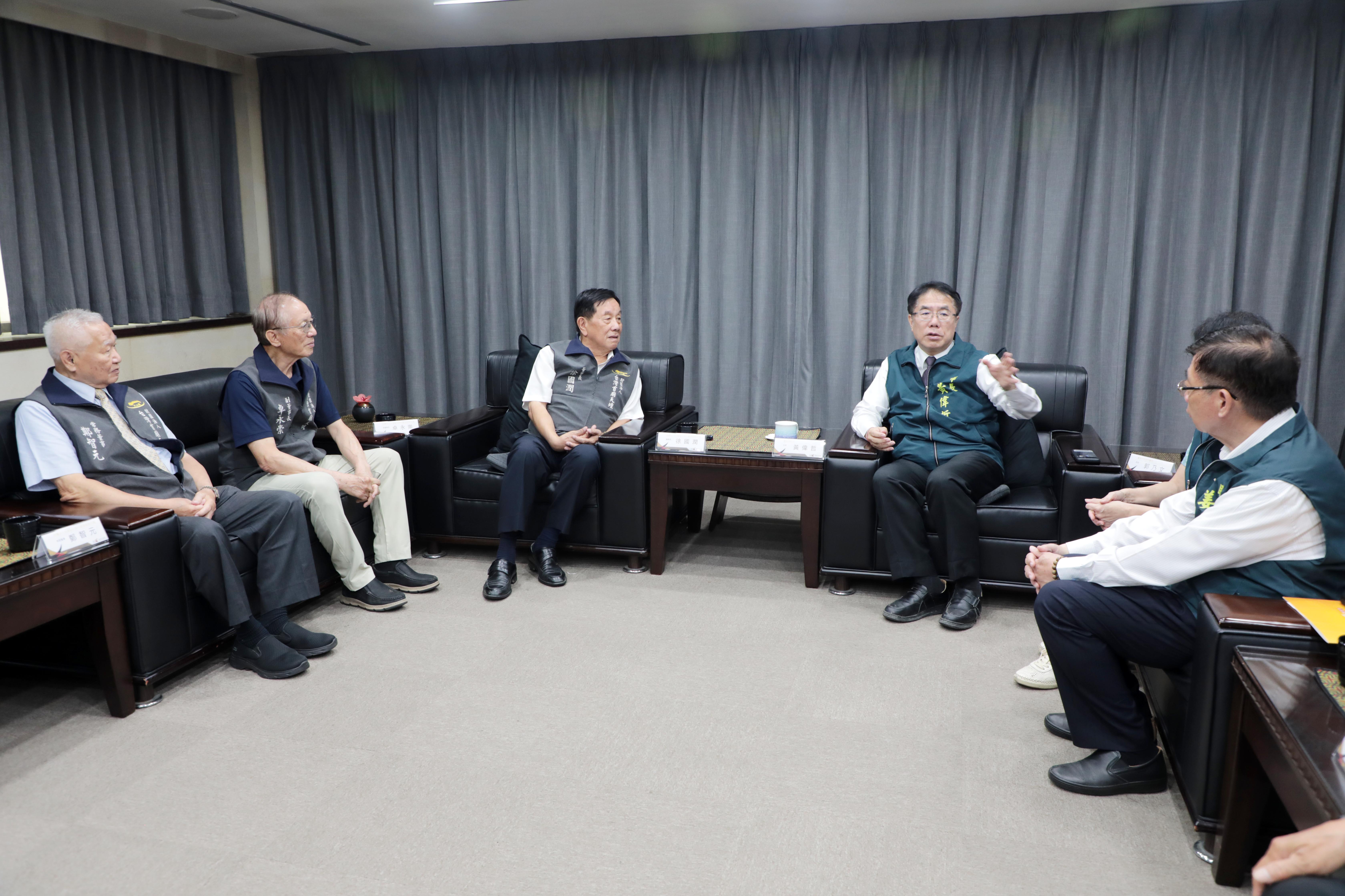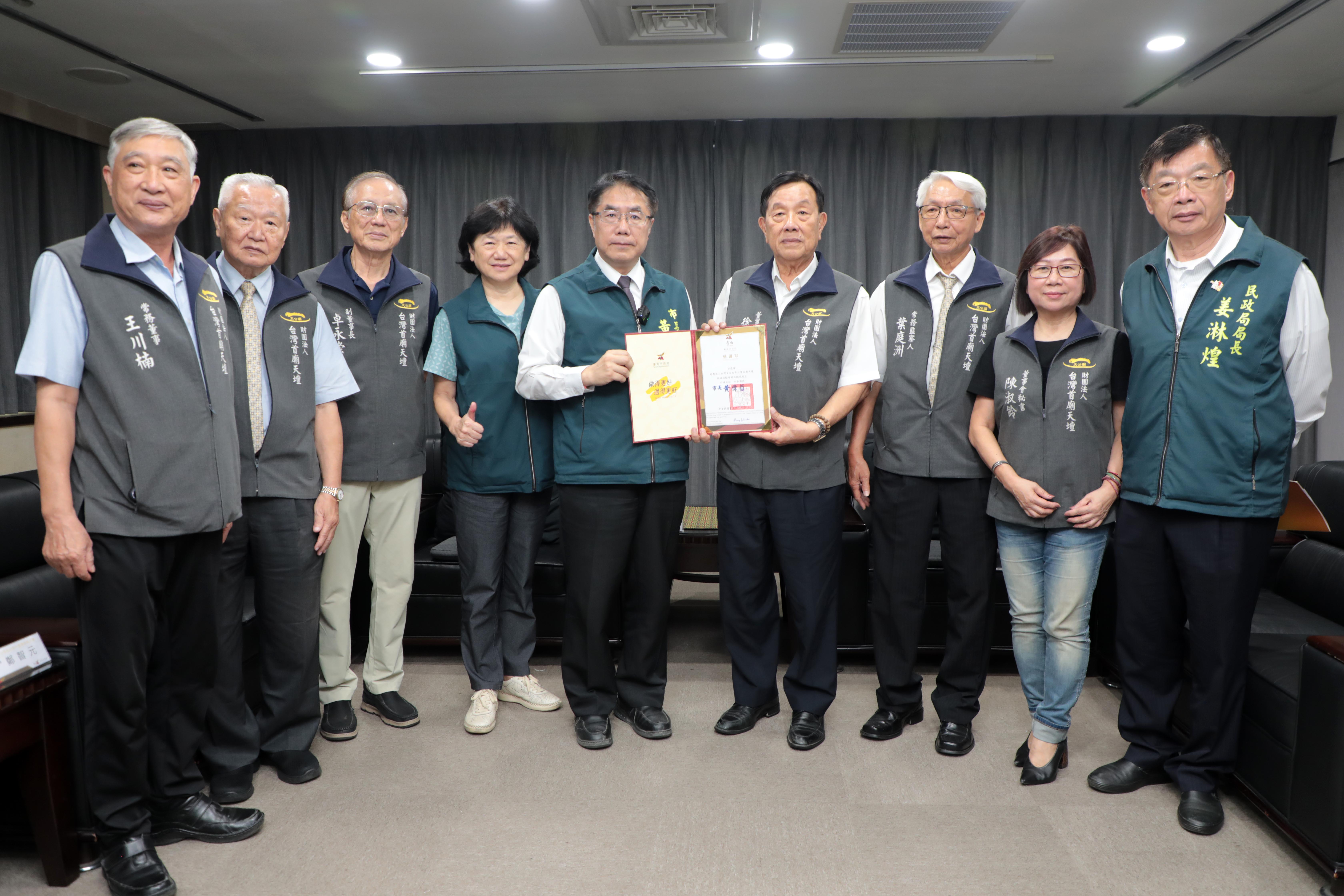 黃偉哲市長在民政局長姜淋煌、社會局長郭乃文陪同下,親自出席感謝首廟天壇董事長徐國潤、副董事長及常務董、監事等一行人,代表市府接受捐款,並回贈感謝狀,表達最誠摯的謝意。