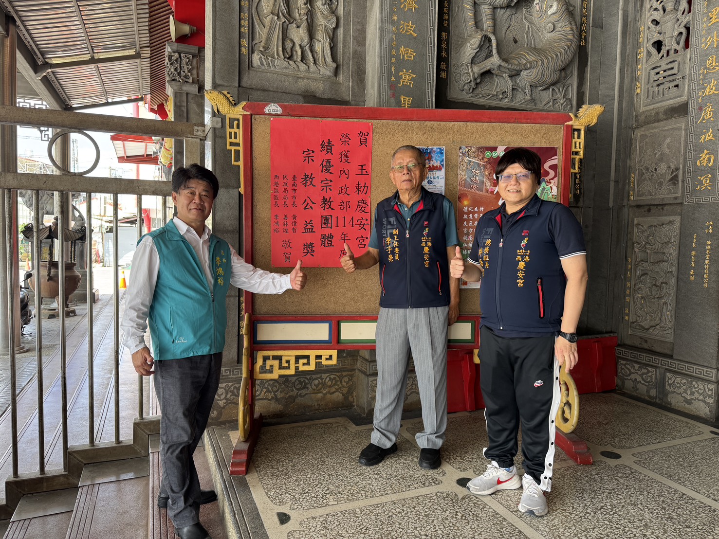 【記者邱仁武/台南報導】西港慶安宮榮獲「內政部114年績優宗教團體宗教公益獎」,西港區長李鴻裕昨天前往貼紅榜祝賀,由副主任委員李子榮、總務組長許語宸等接待,表達祝賀之意。