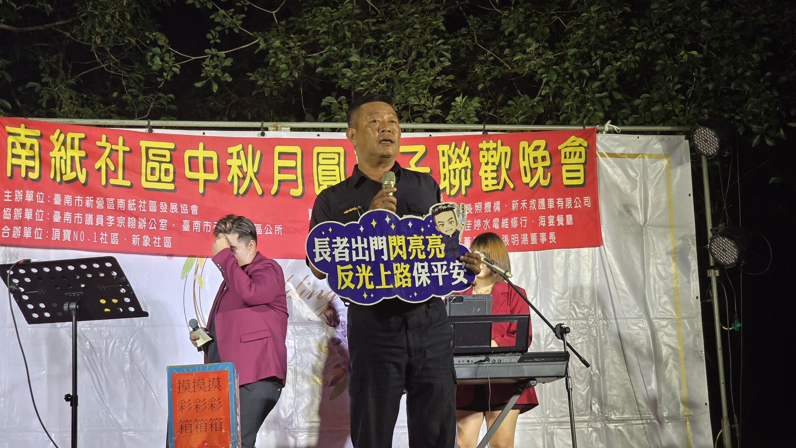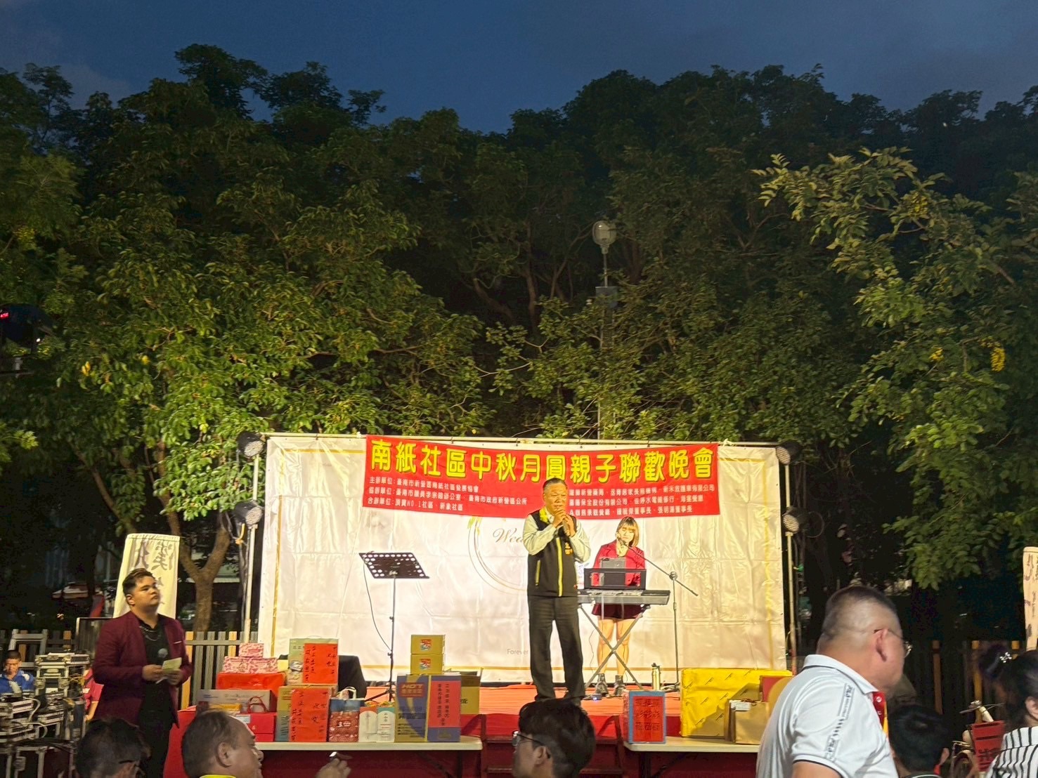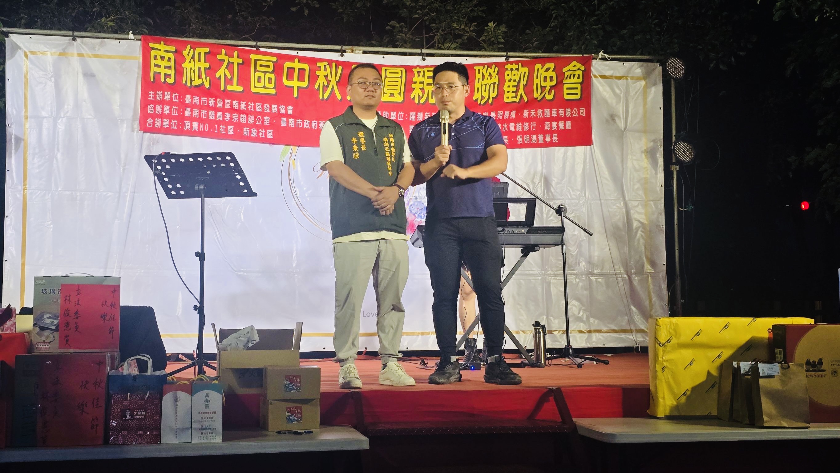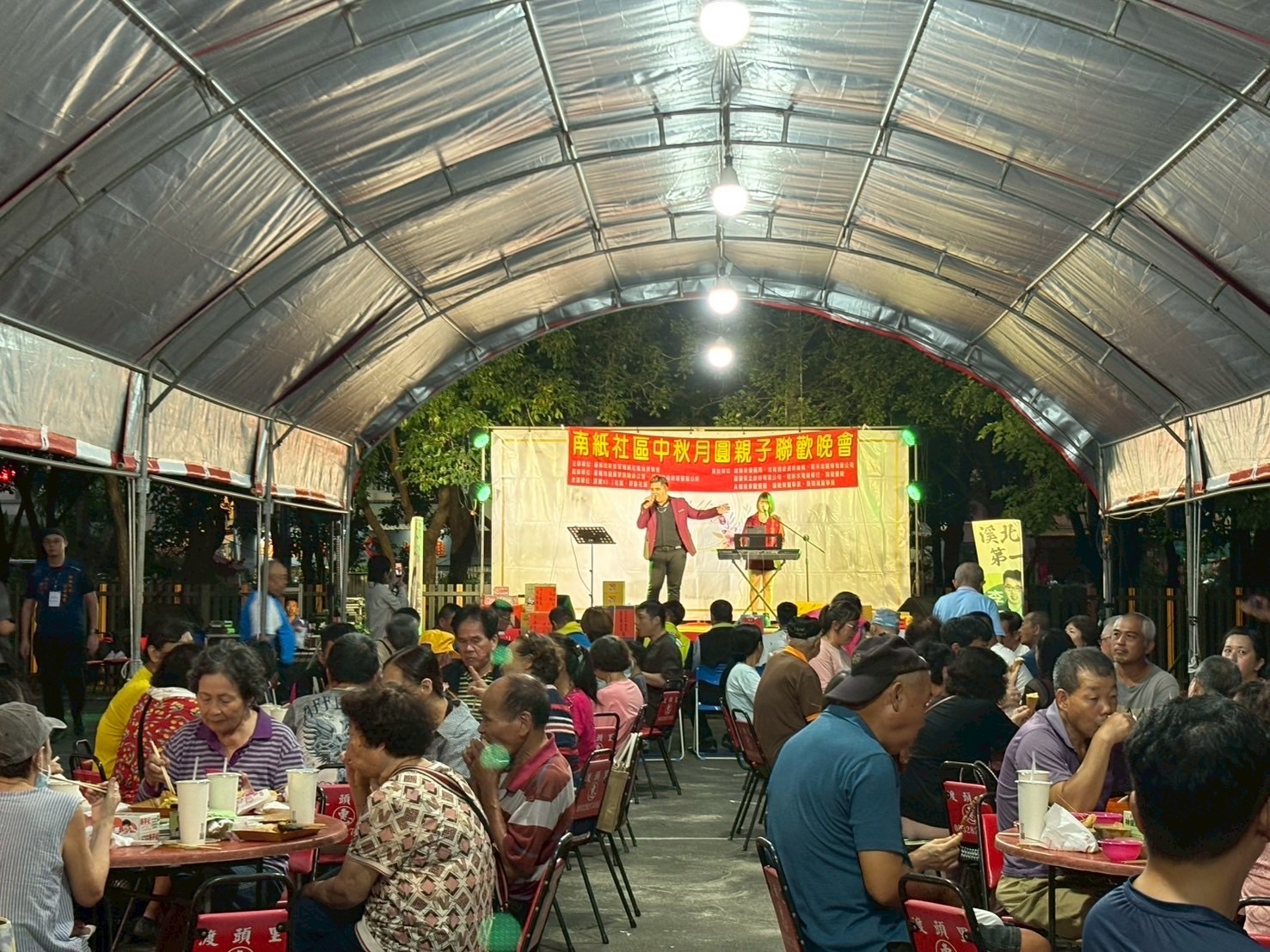 中秋節聯歡晚會現場有精緻聲光舞台、主持人和歌手演唱、抽獎,還有新營分局太宮所防詐宣導活動,還特別邀請了燒烤車、地瓜球、雞蛋糕、現榨果汁、霜淇淋、撈魚水球等美食遊戲攤商進駐社區擺設攤位,讓大家可以盡興品嚐美食遊玩。
