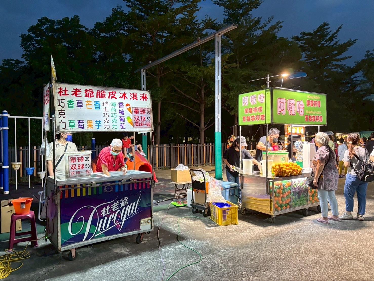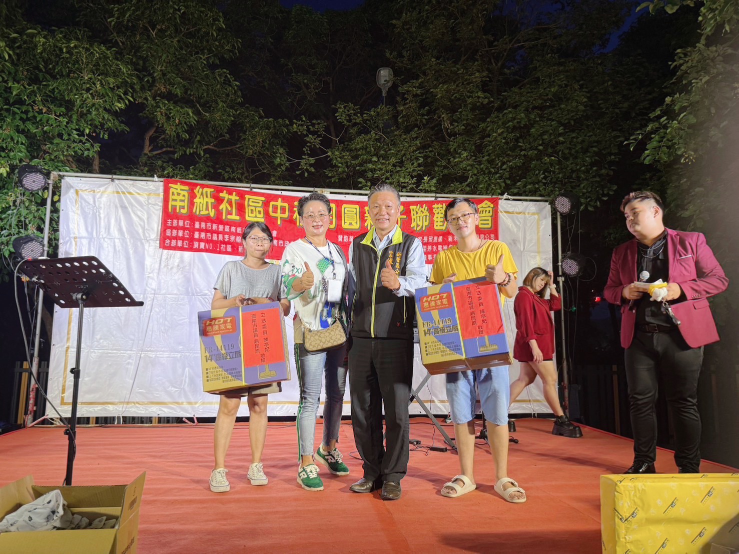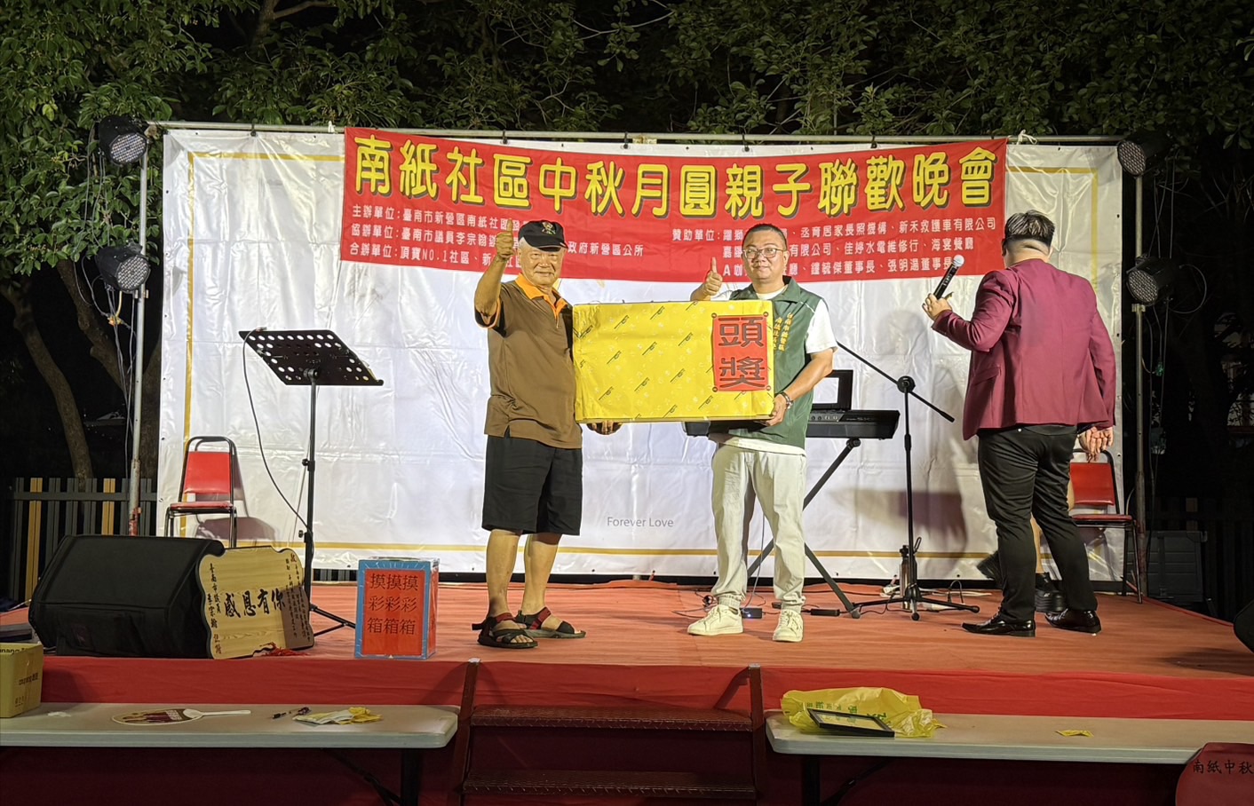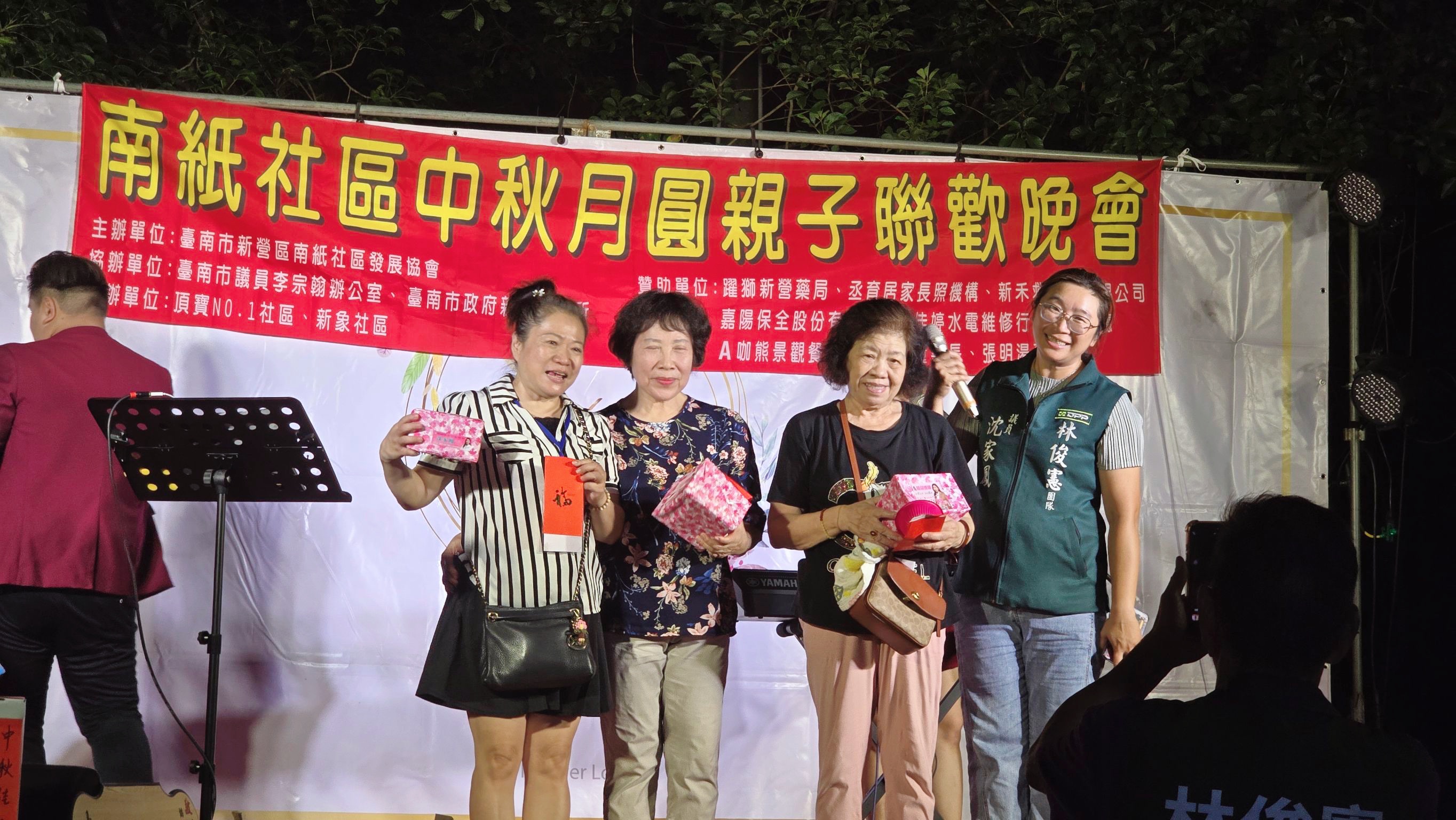 中秋節聯歡晚會現場有精緻聲光舞台、主持人和歌手演唱、抽獎,還有新營分局太宮所防詐宣導活動,還特別邀請了燒烤車、地瓜球、雞蛋糕、現榨果汁、霜淇淋、撈魚水球等美食遊戲攤商進駐社區擺設攤位,讓大家可以盡興品嚐美食遊玩。