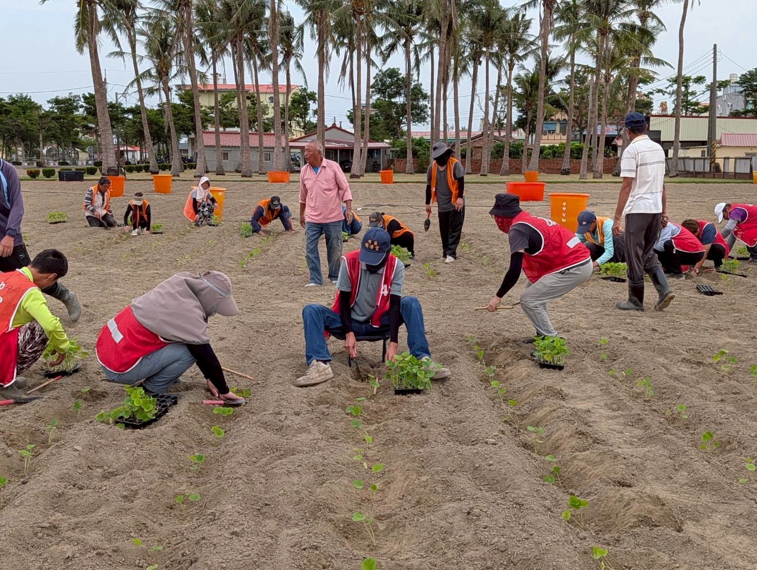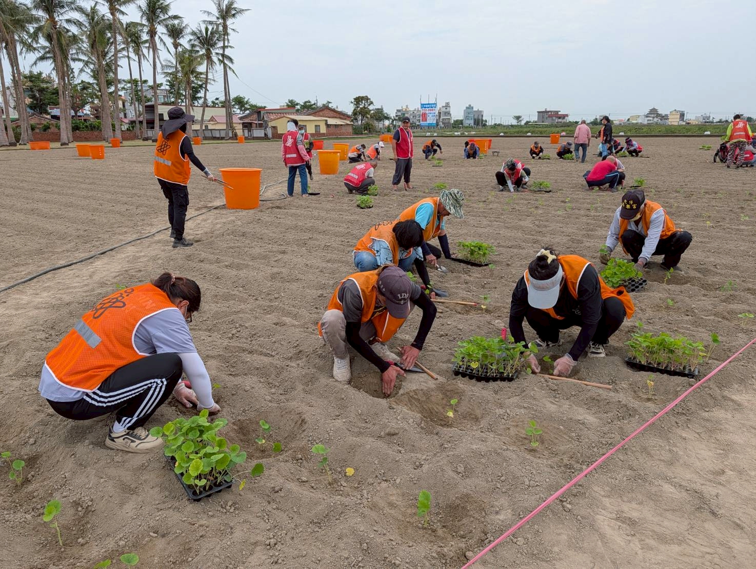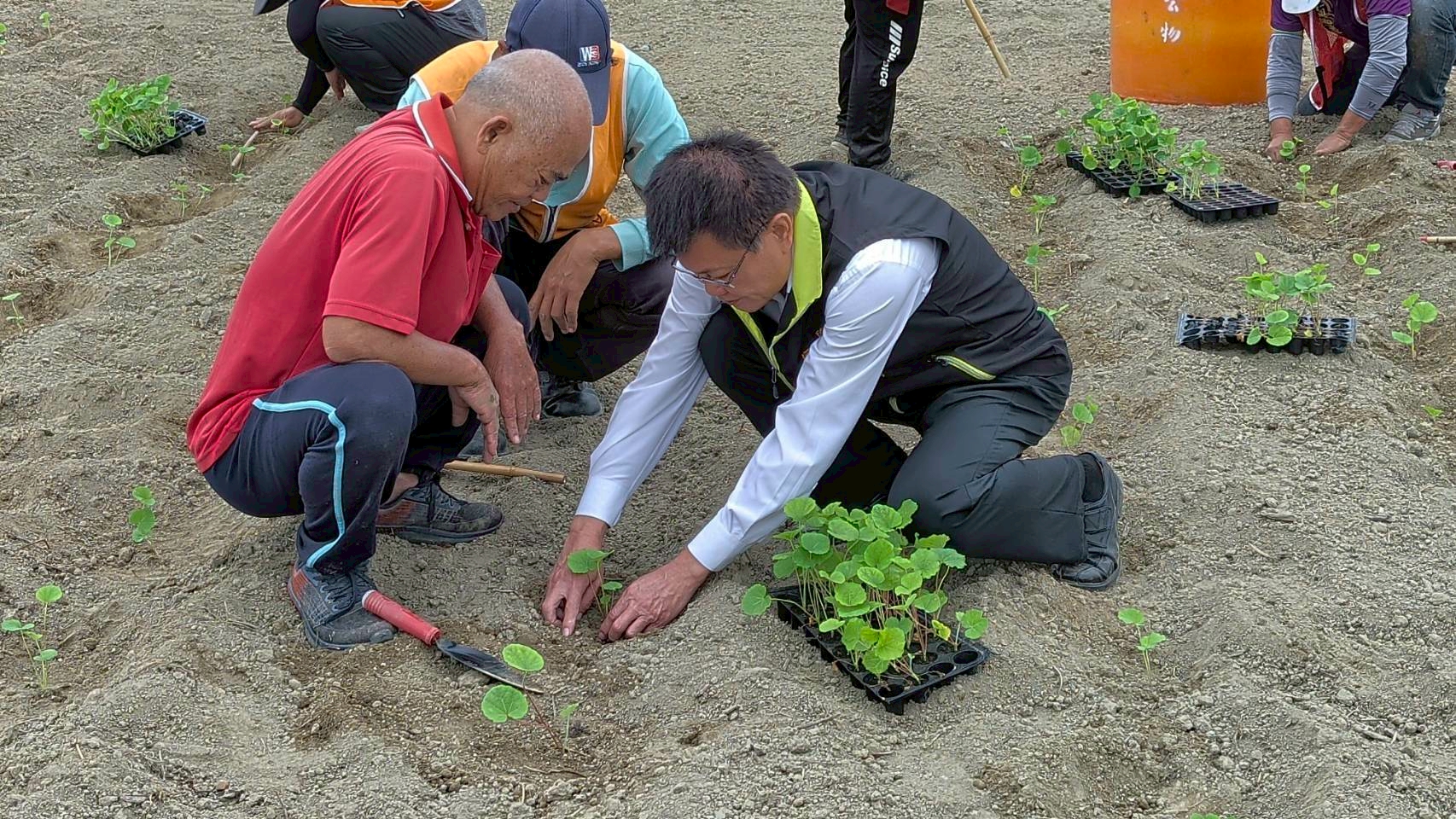 【記者邱仁武/台南報導】學甲蜀葵花種植已邁入第13年,學甲區公所昨天展開蜀葵花種植工作,由蜀葵花專家光華里長邱益在親自指導公所同仁、雇工及台南地方檢察署易服勞役專案人員60餘人,齊心合作,以人工方式將一株株蜀葵苗細心種入田中,隨即展開澆水作業。