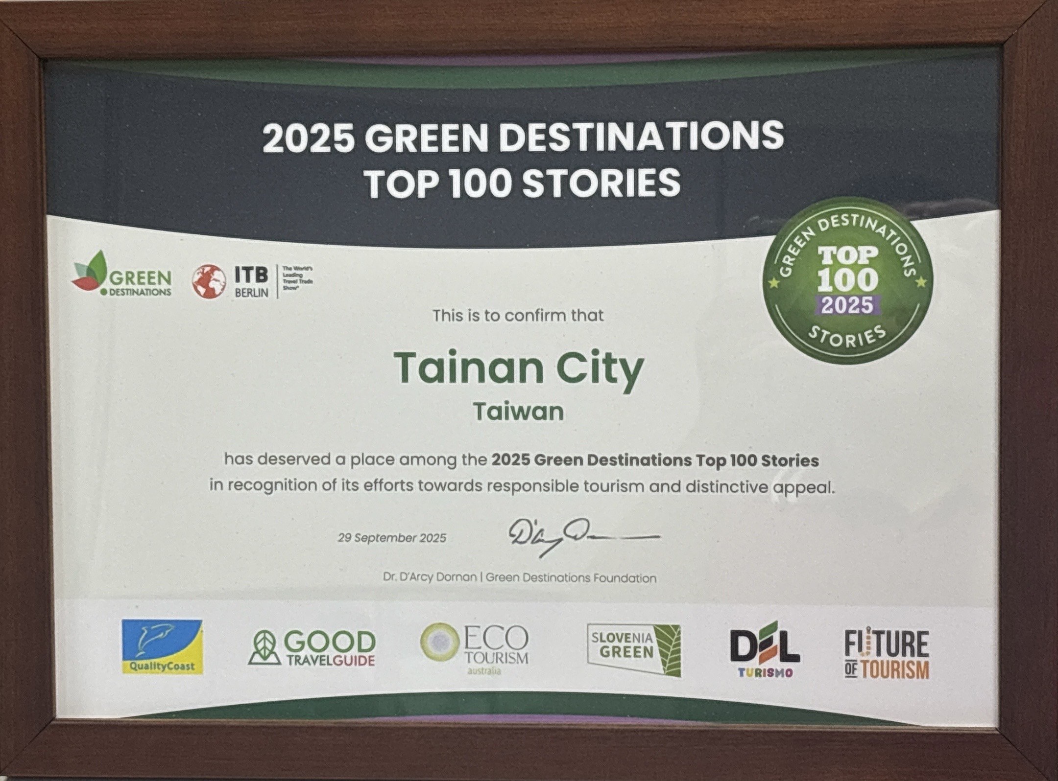 這是一個國際級的競賽,台南市首次參加全球百大目的地故事競賽,與38個國家、180多個旅遊目的地一同角逐獎項,並入選全球百大目的地故事之一,是台灣唯二獲此殊榮的城市。
