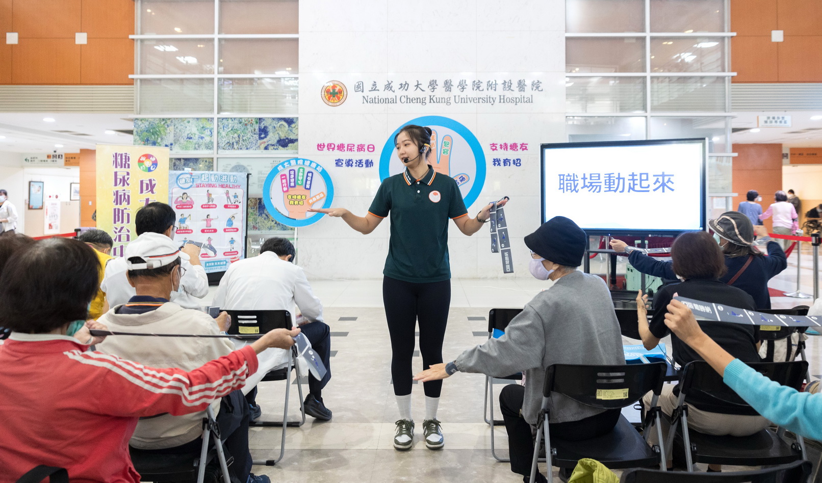 活動現場舉行「五指承諾」宣誓儀式,參與人員齊舉右手,朗誦「理解、接納、關心、促進、行動」五大行動口號,象徵打造糖友友善職場的決心。活動安排包括根秀欽老師主講「幸福職場五力圈」講座,分享職場支持糖友的實務策略;以及陳怡臻教練帶領的「椅子肌力+彈力帶運動」體驗,鼓勵民眾在工作之餘適度活動筋骨,養成職場健康習慣,現場氣氛熱絡、互動溫馨。