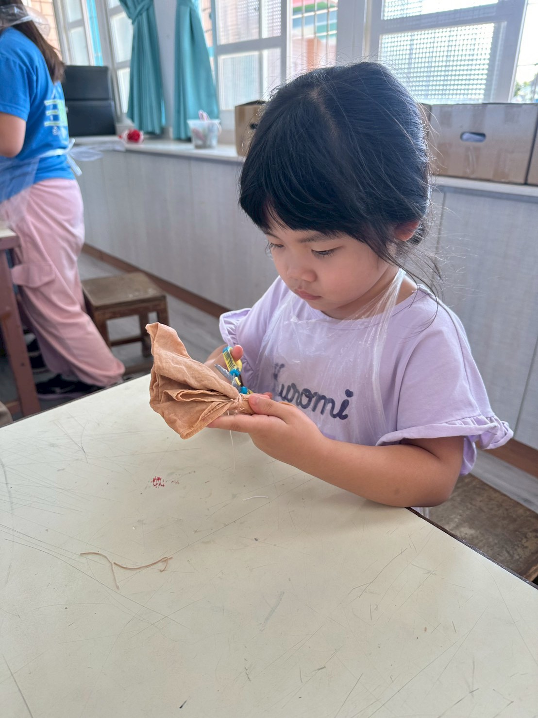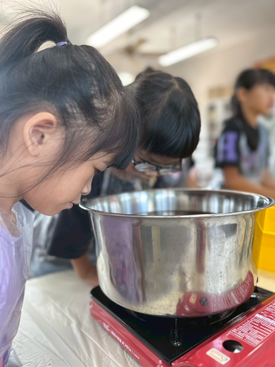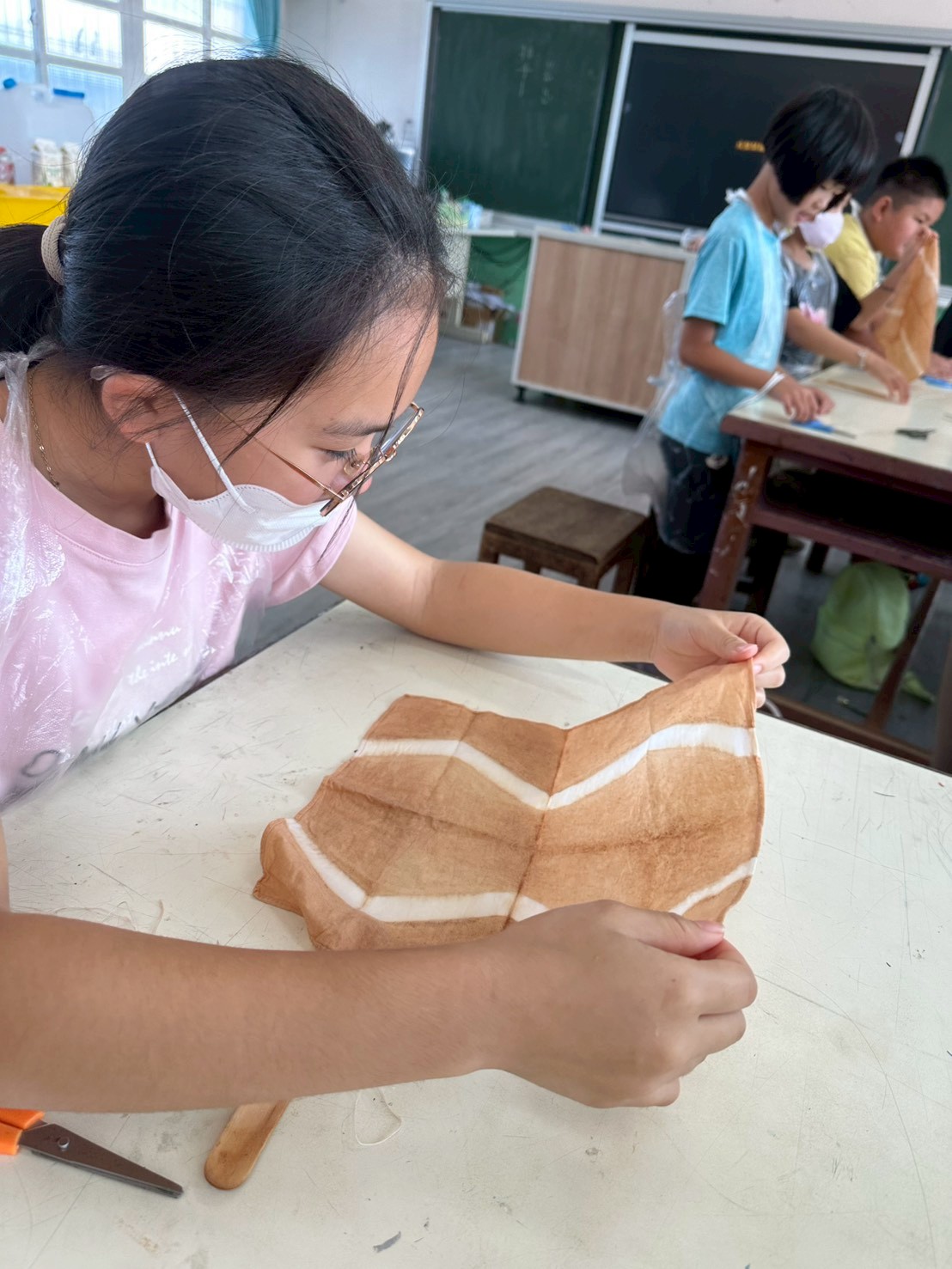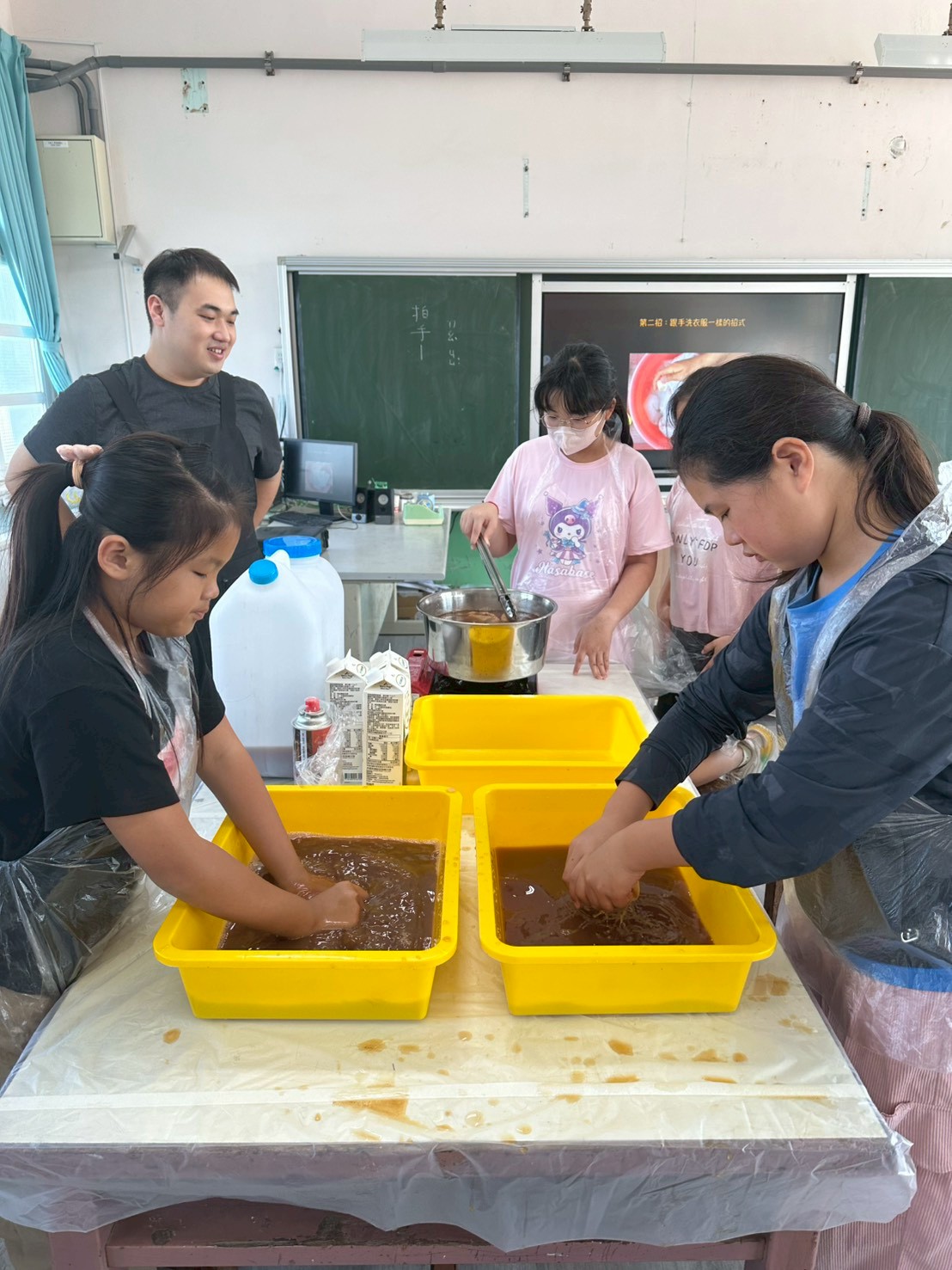 張順治講師表示,這次紮染課程的靈感源自藍染技法。進行多次試驗,發現紅蔥頭煮出的染汁色調溫潤且層次自然,非常適合孩子創作,因此決定將這份「在地食材、創意染色」的想法帶入校園。