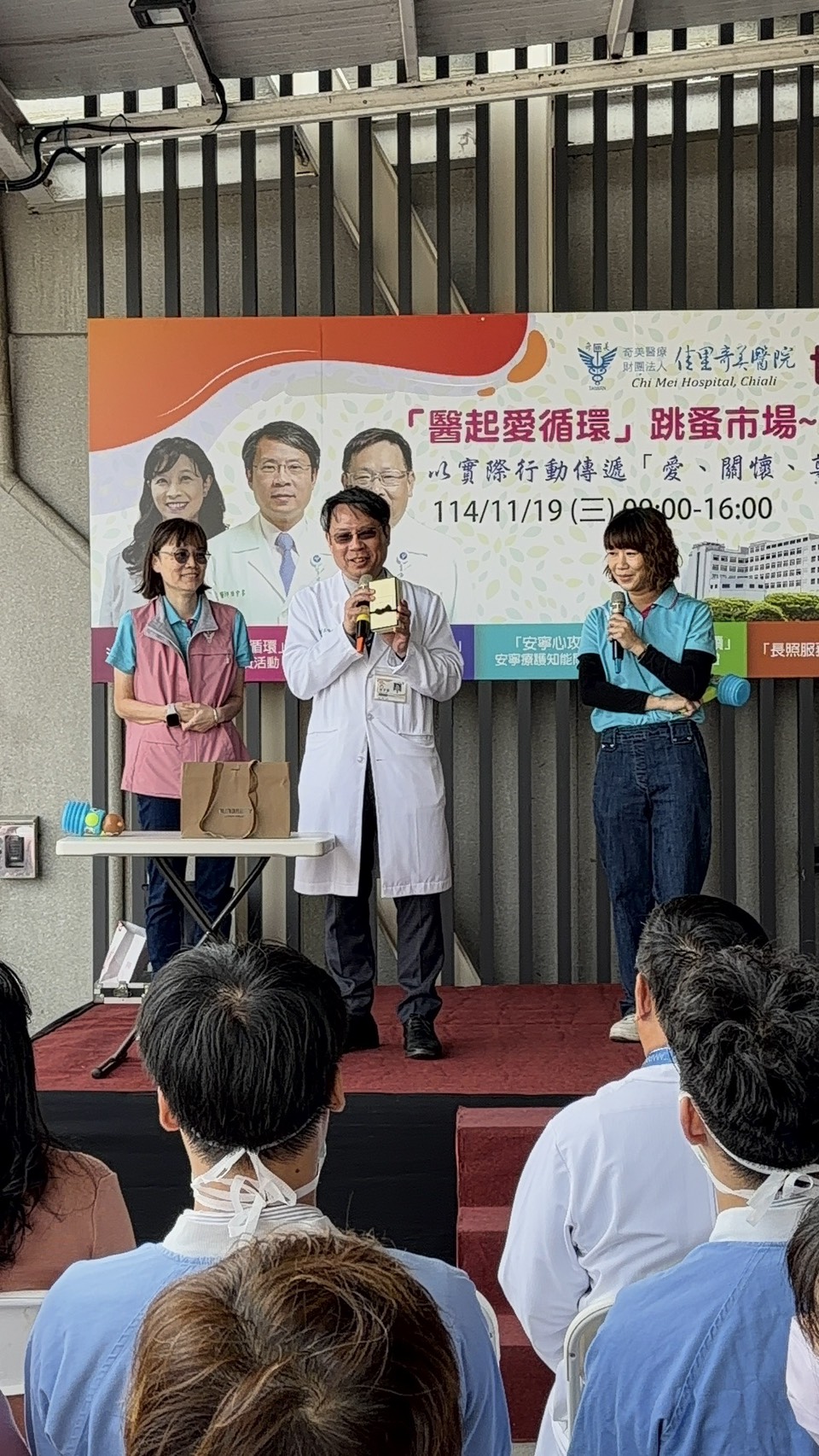 【記者邱仁武/台南報導】佳里奇美醫院今天舉辦「114年度世界安寧日」系列活動,由護理部專任護理團隊主辦,透過公益義賣、愛心競標以及多元衛教攤位向民眾推廣安寧療護理念,「公益義賣」由醫院員工捐贈物品供民眾選購,所得全數捐入社服基金,作為安寧療護基金、協助弱勢家庭,場面相當熱絡溫馨。.※今天活動主題「醫起愛循環」以愛心義賣揭開序幕,「愛心競標」活動由院長田宇峯、副院長王哲川、邵詩媛親自站台主持義賣競標,得標民眾還可獲得院長及副院長的個人親筆簽名留念,更增添活動趣味,也吸引眾多社區民眾參與,溫馨熱絡的現場氣氛有如小型嘉年華會。