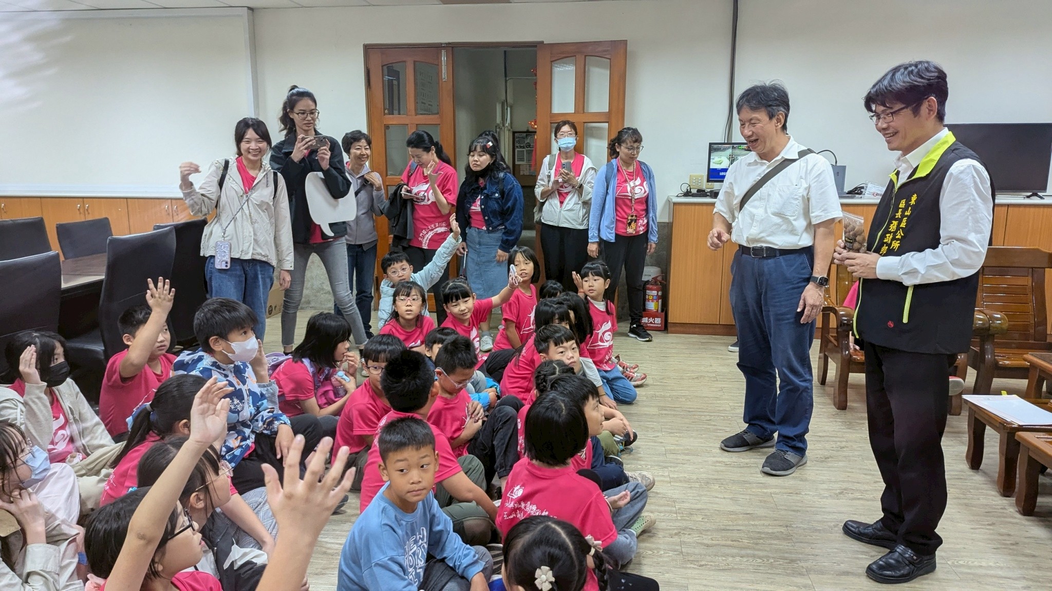 一行人隨後拜訪了東山區長張政郎,區長為大家解說了東山的在地特產,包括龍眼乾與山楂烏龍,孩子們聽得入迷,北門國小師生特別致贈了感謝卡和感謝狀。