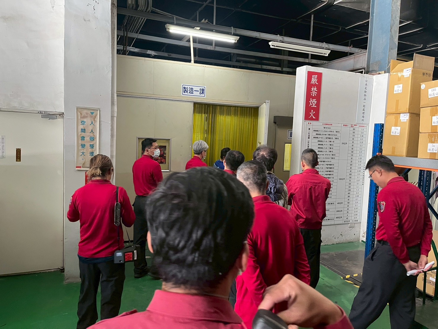 與會消防人員確認電氣線路、機具運轉狀況及滅火器材配置,並針對廠內部分區域曾發生短路或燃燒事件的案例進行現場研討。廠方也詳細說明製程中涉及的易燃溶劑與氣體管理方式,雙方交換應變經驗,期望降低災害風險。