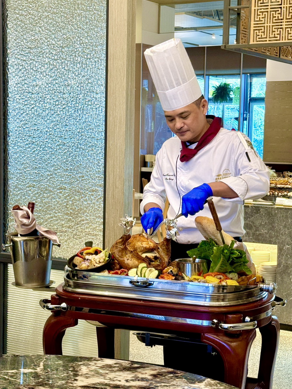 威尼斯餐廳以豐盛海味享譽台南,平日供應帝王蟹煲、鮑魚土瓶蒸、松露茶碗蒸、假日加碼松葉蟹腳,鮮甜飽滿的廣島牡蠣於假日供應,亦是餐檯熱門品項。即日起~聖誕節期間,除了增加許多聖誕料理,12/24-25午、晚餐更提供柴燒木燻松露火雞桌邊服務,由主廚推出火雞專車,逐桌為貴賓現場片切。