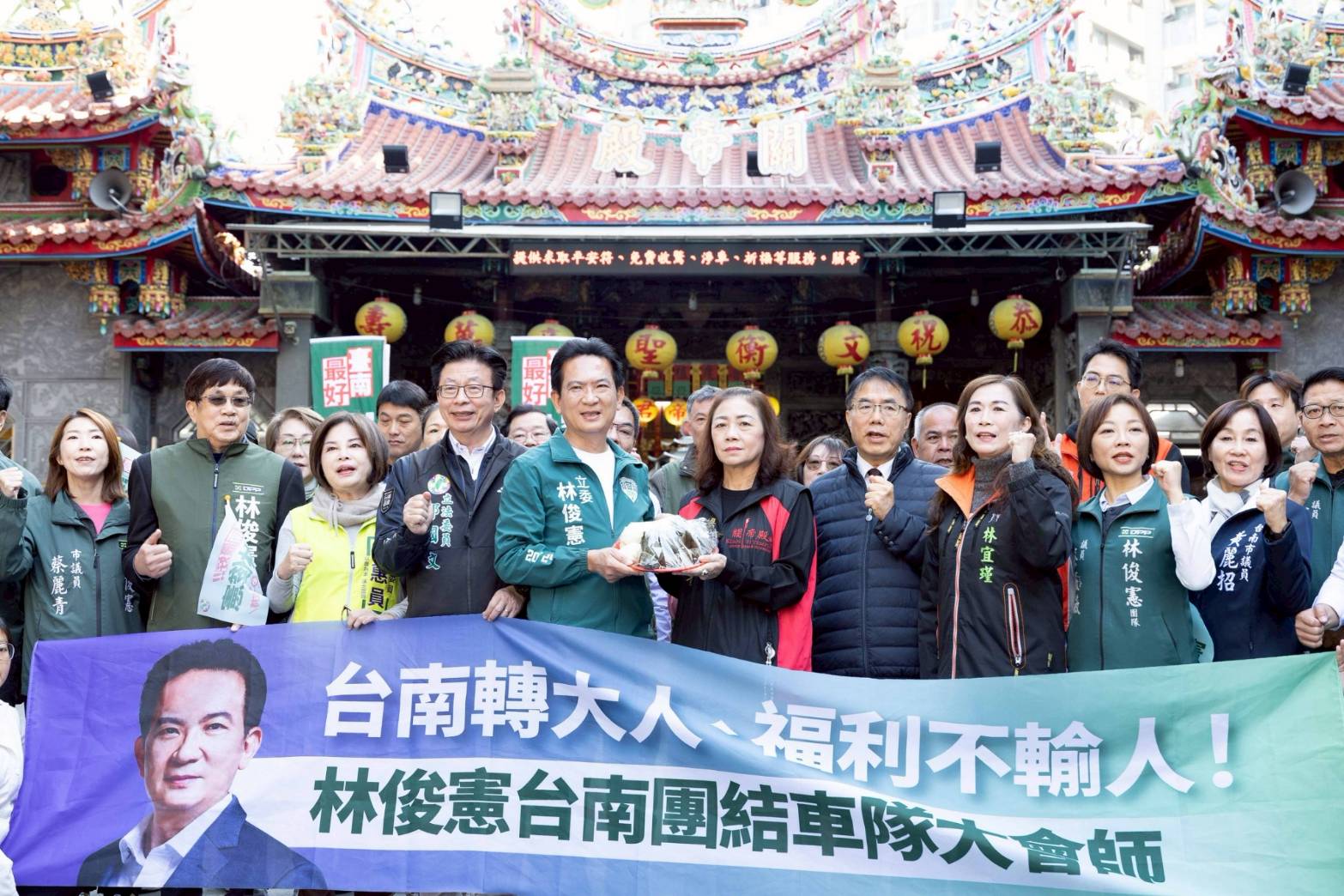 在車隊大會師的現場,關帝殿的許主委及幹部現身,送上包子與粽子表達支持。林俊憲與3位立委,林志展副議長團隊及黃麗招、蔡麗青、朱正軒、黃肇輝、沈震東、李啟維、李宗霖、蔡筱薇、郭鴻儀等多位議員,在縣市合併即將滿16年之際,以「做十六歲」的台南傳統,共同喊出「台南轉大人、福利不輸人」。希望以6都首創的長輩免費接種皮蛇疫苗、學童午餐牛乳多一杯等政見,未來將打造台南成為六都社福第一的城市。