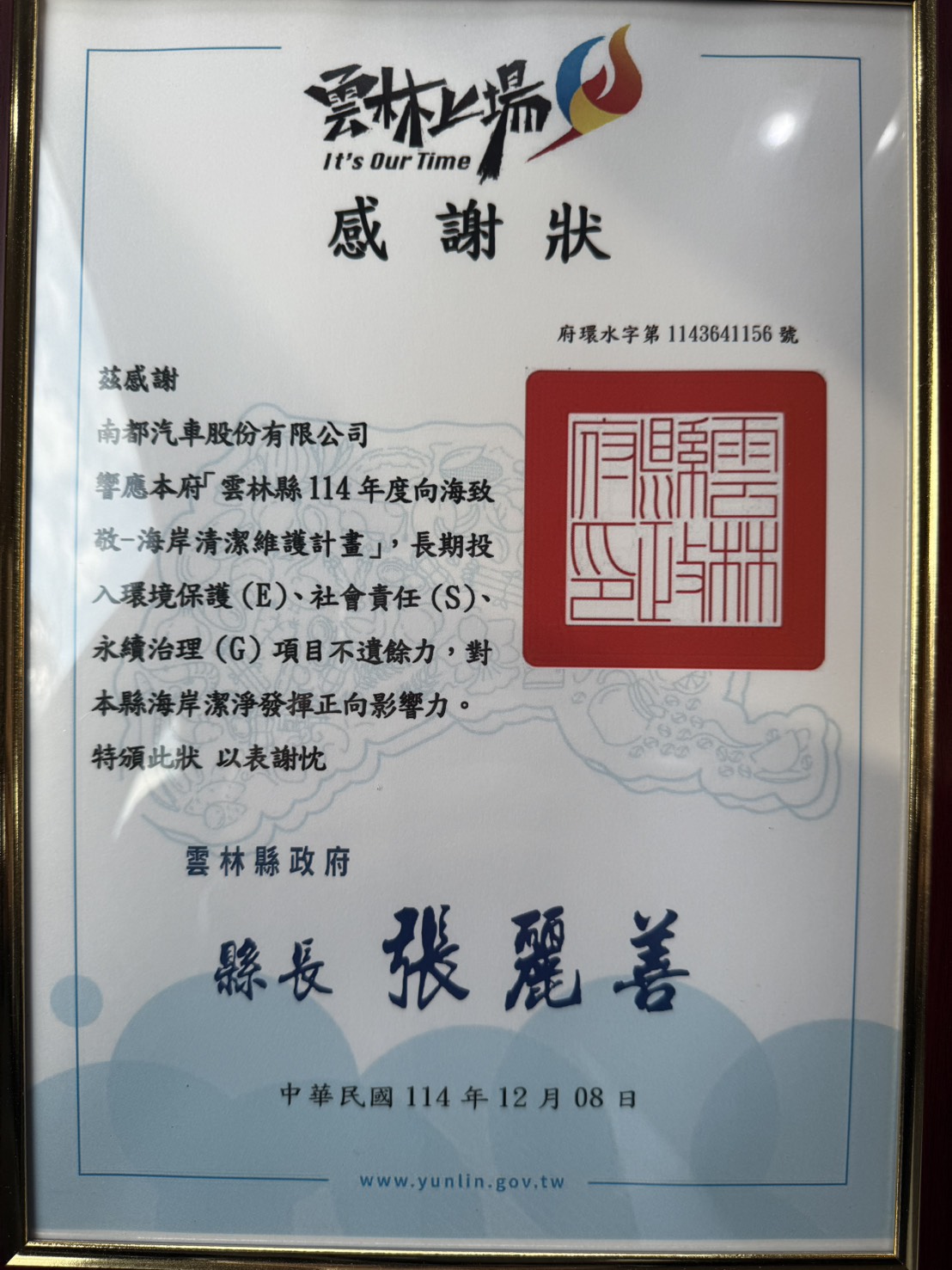 【記者邱仁武/台南報導】南都汽車持續以實際行動落實企業社會責任,攜手公部門共同守護海岸環境,於17日由顧客關懷部陳南何部長代表公司,出席雲林縣政府環保局舉辦「114年海岸認養單位」表揚活動,並獲頒感謝狀,肯定南都汽車長期投入海岸認養與環境維護工作的努力與成果。