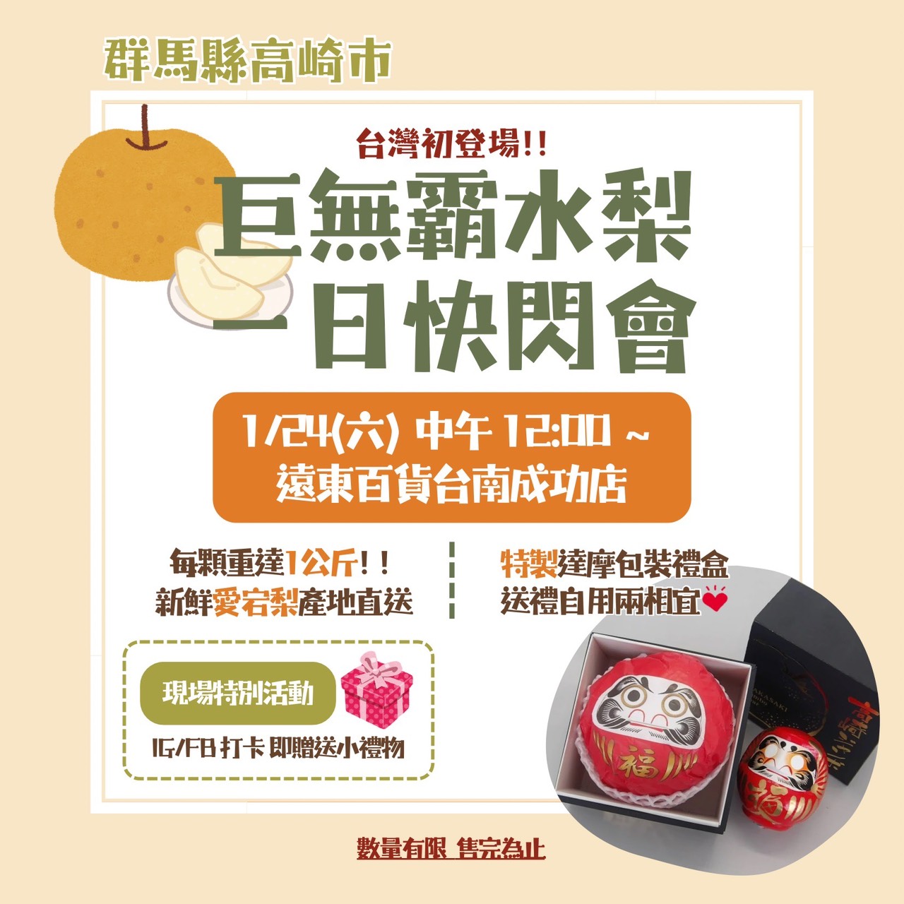 此次,高崎市將於1月24日(星期6)中午12點在台南大遠百1樓的戶外廣場舉辦「高崎巨無霸水梨1日快閃活動」,每顆重達1公斤,新鮮直送的「愛宕梨」外,還搭配日本象徵吉祥的達磨包裝禮盒,非常適合年節送禮喔!