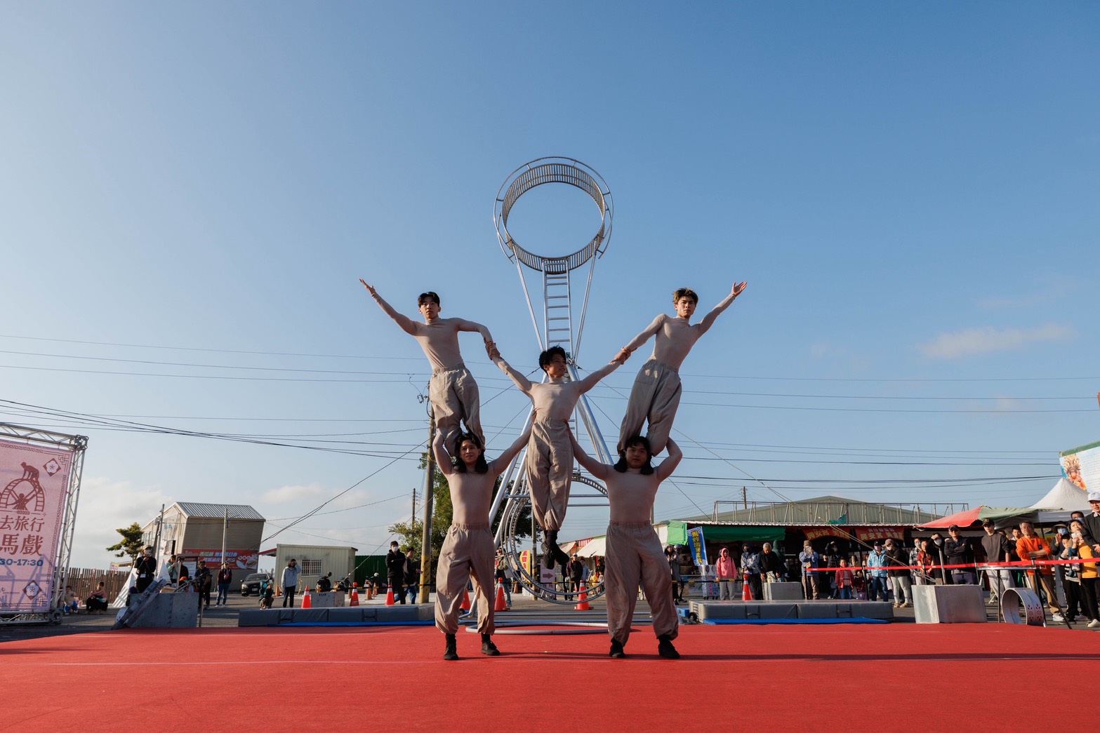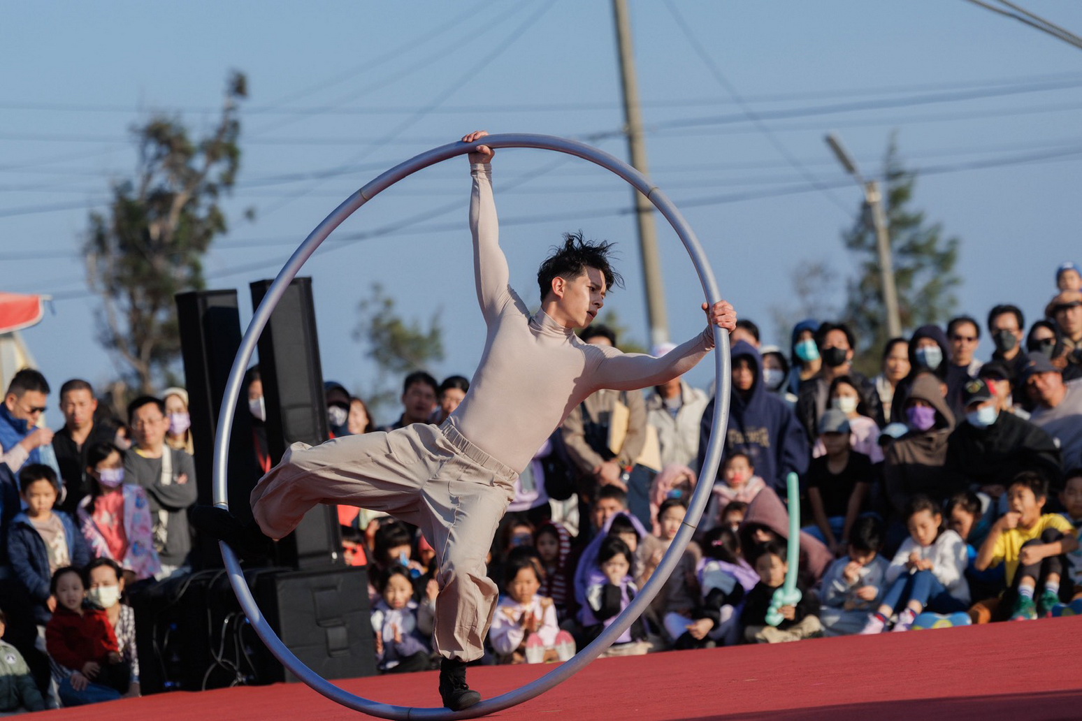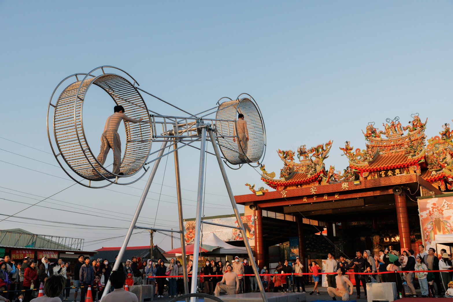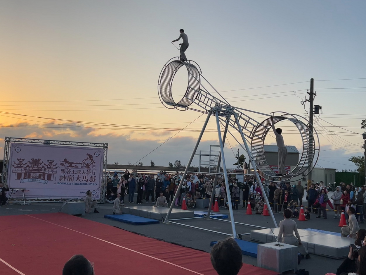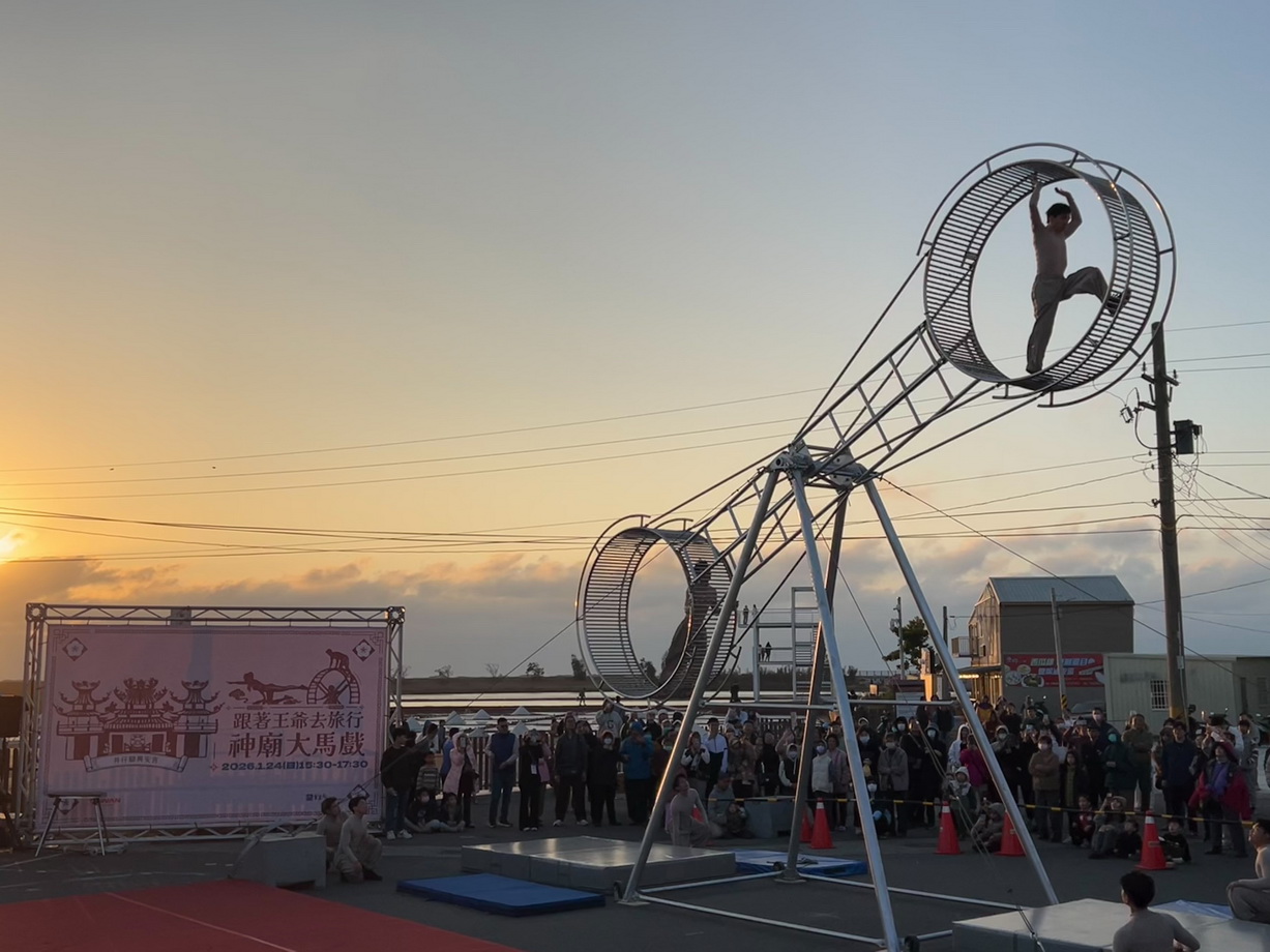 【記者邱仁武/台南報導】由交通部觀光署雲嘉南濱海國家風景區管理處辦理的「北門王爺藝饗節」,24日在北門井仔腳興安宮盛大登場,「神廟大馬戲」以 10 公尺巨型特技輪為核心,結合跑酷與高空走繩等高難度技藝,在傳統廟埕打造震撼的沉浸式視覺饗宴,吸引親子遊客逾2千人次前往觀賞,現場尖叫與掌聲不斷,氣息沸騰。