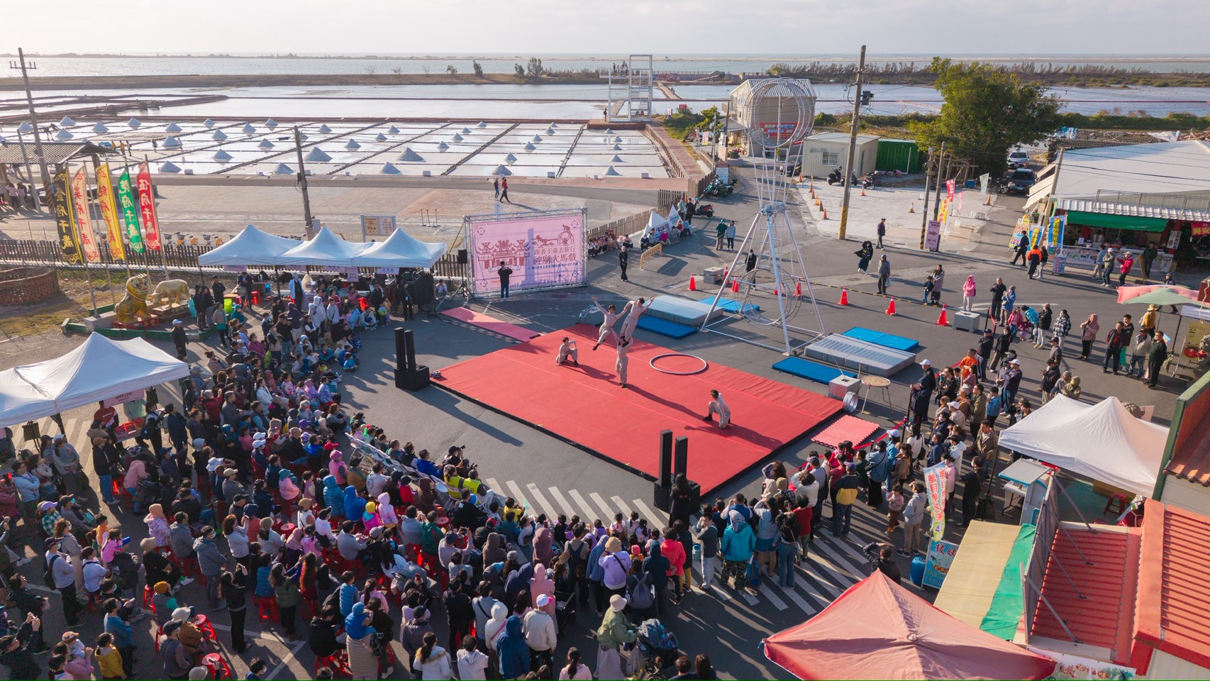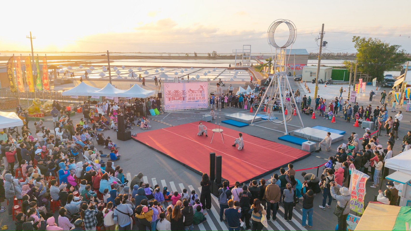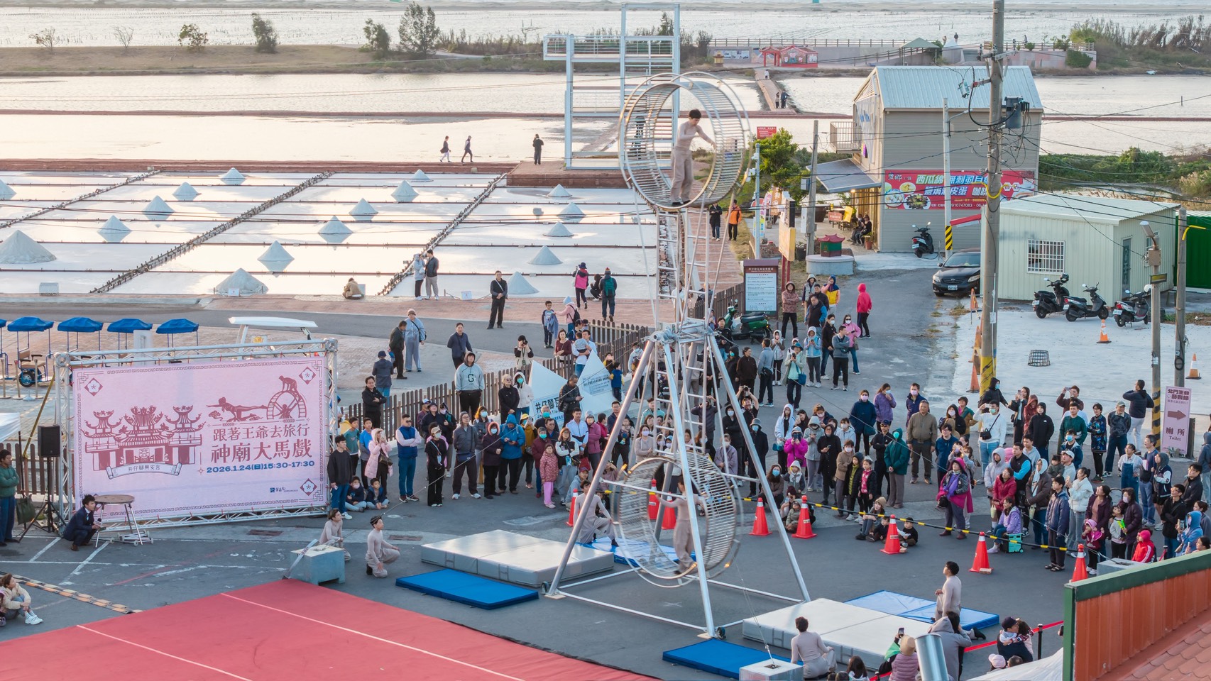 雲管處長徐振能表示,這次「神廟大馬戲」突破傳統舞台框架,將大型特技裝置移至宮廟廣場,演出團隊在高空巨輪上進行高速移動、平衡與翻轉動作,並藉由跑酷流動身法與高空走繩技巧,展現極高技術門檻與演出張力,搭配旁邊鹽田美景,讓觀眾近距離感受馬戲藝術的驚險與美感,也為北門廟埕地景注入全新藝術能量。同時,現場還有精彩魔術表演互動,讓父母小孩歡笑連連。
