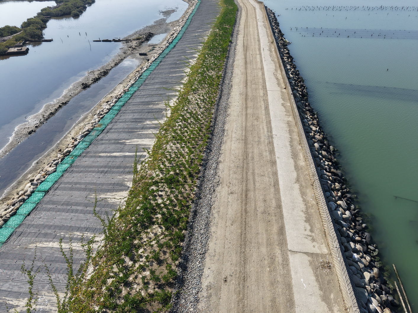 水利局長邱忠川補充,工程在規劃設計階段即導入多項生態與低碳理念,減少混凝土使用,改以天然材料施作,整體工程碳排量相較傳統工法降低近九成。未來透過補植海桐、苦檻藍、馬鞍藤等原生濱海植物,持續復育濕地植生,並結合拋石工法營造多孔隙棲地環境,可望達成防洪安全、濕地生態與親水環境共融的多重效益。