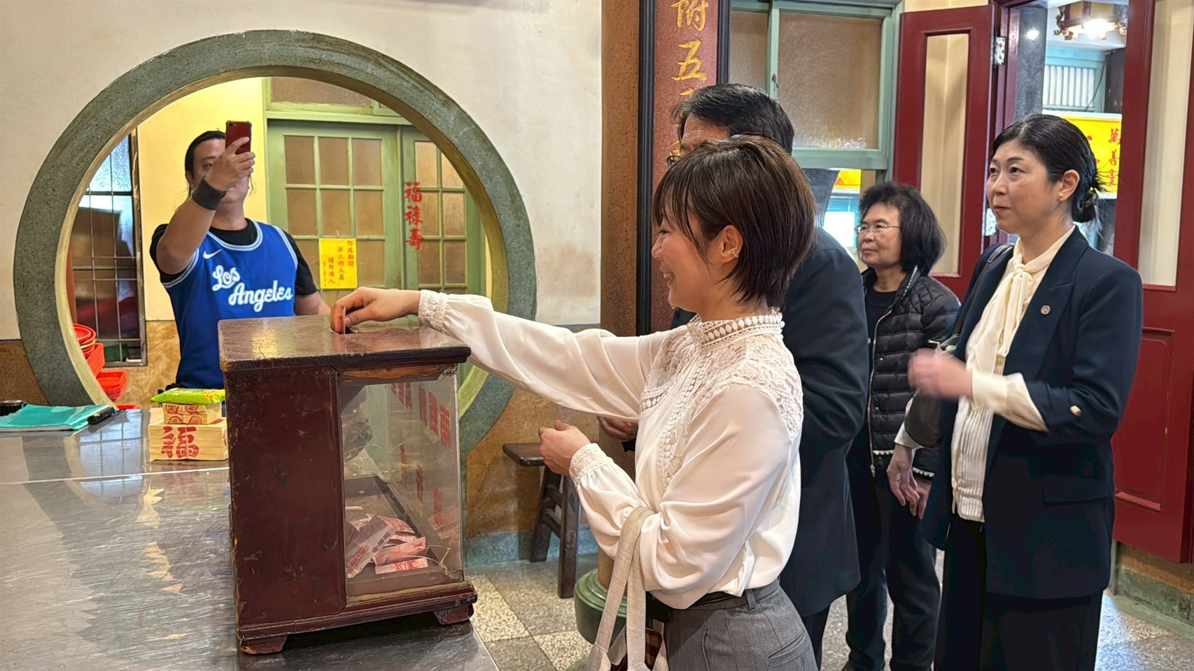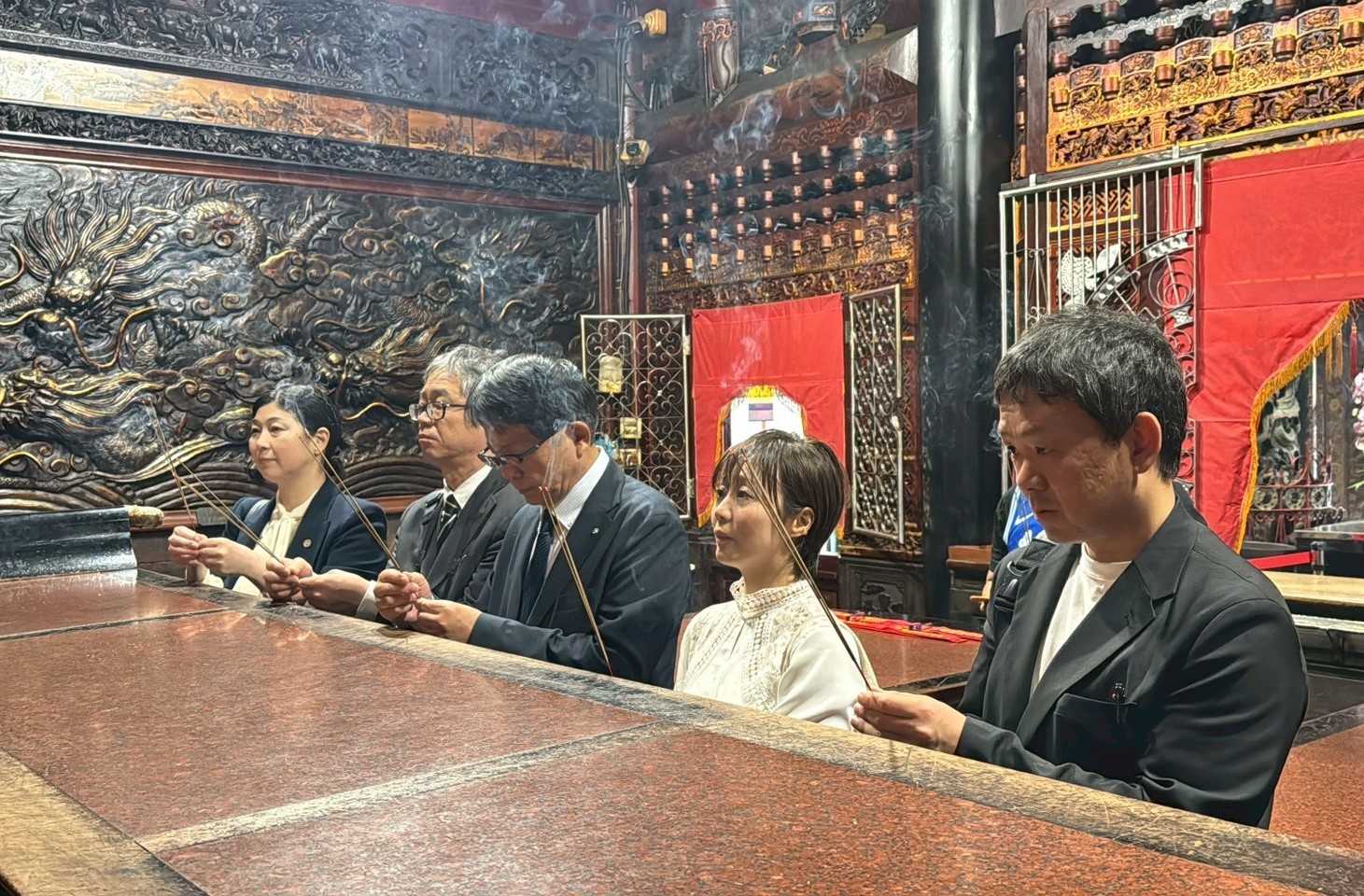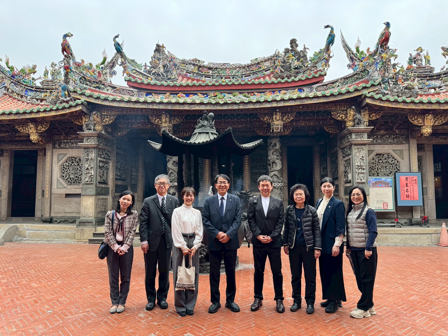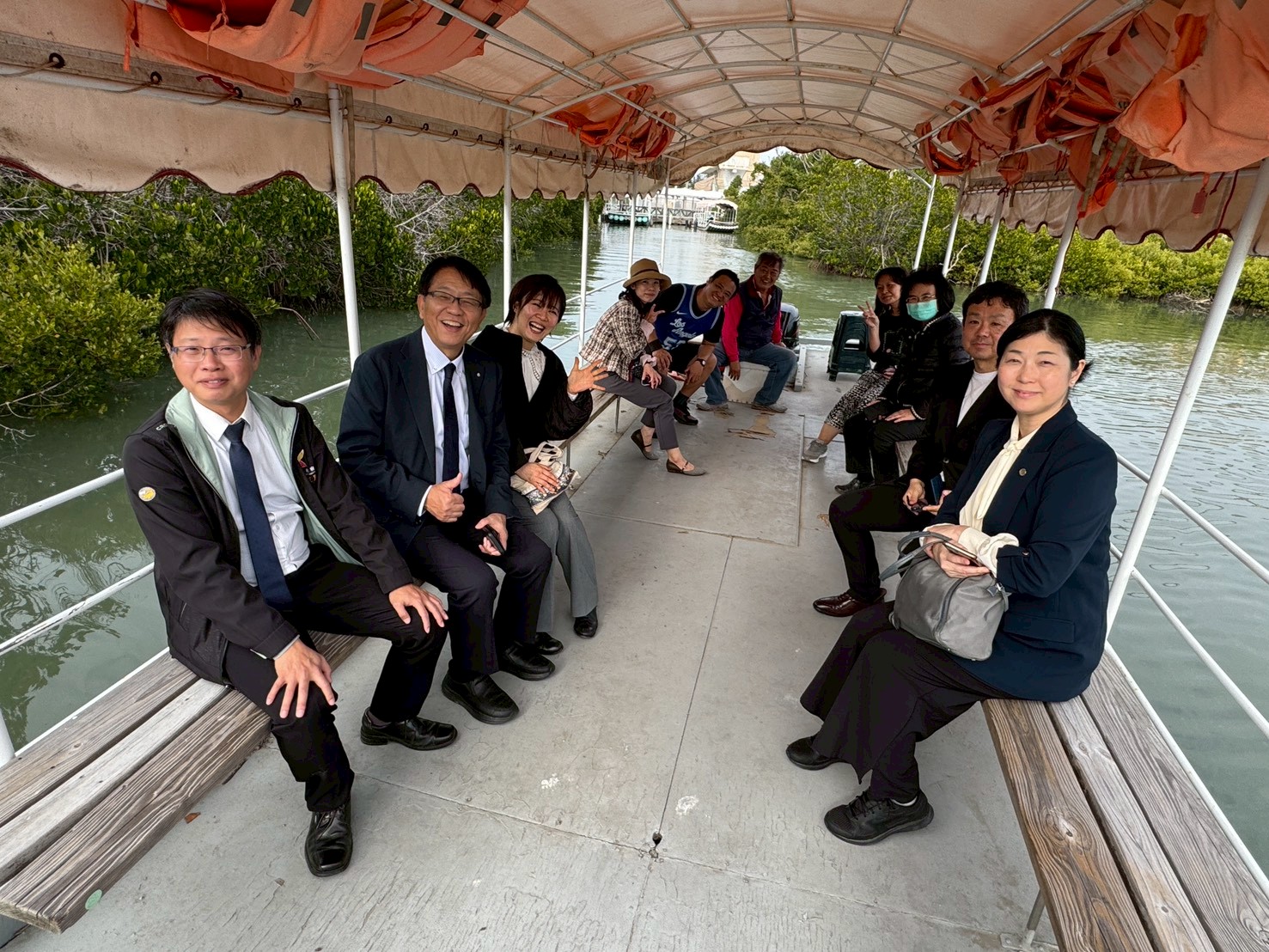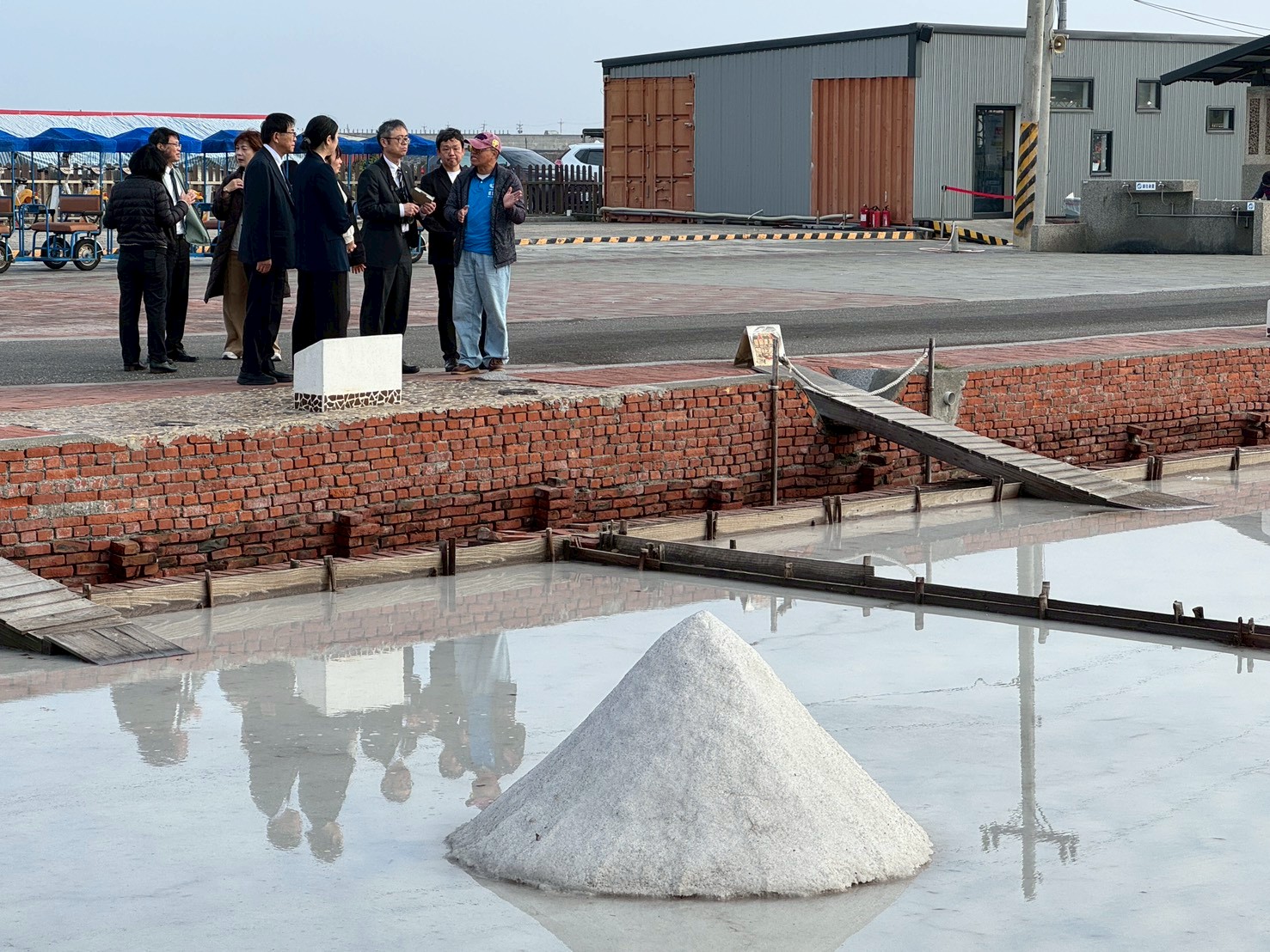 日本訪問團上午前往台灣王爺總廟南鯤鯓代天府參拜,親身體驗北門深厚的宗教文化與建築之美。下午轉往雙春愛莊園踏查紅樹林生態,並於夕陽時分抵達井子腳瓦盤鹽田,潔白鹽堆映照落日餘暉,讓訪團成員對北門保存產業文化與自然景觀的用心留下深刻印象。