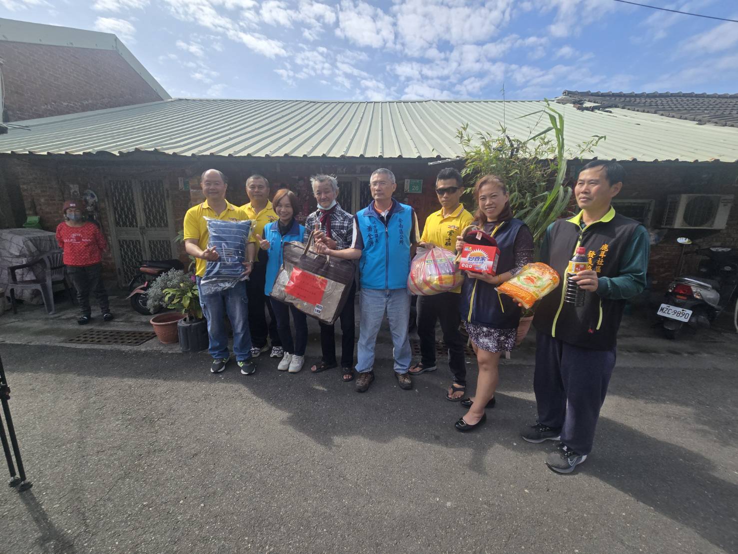 27日在安南區副區長郭孟淑、鹿耳社區理事長蔡登進、台江常民生活關懷協會理事長顏鳳君、常備士官班校友會總幹事胡瑞忠及志工協助下,共同將此批物資分送給轄區內獨居長輩,同時送上餐食、和過年物資一袋。