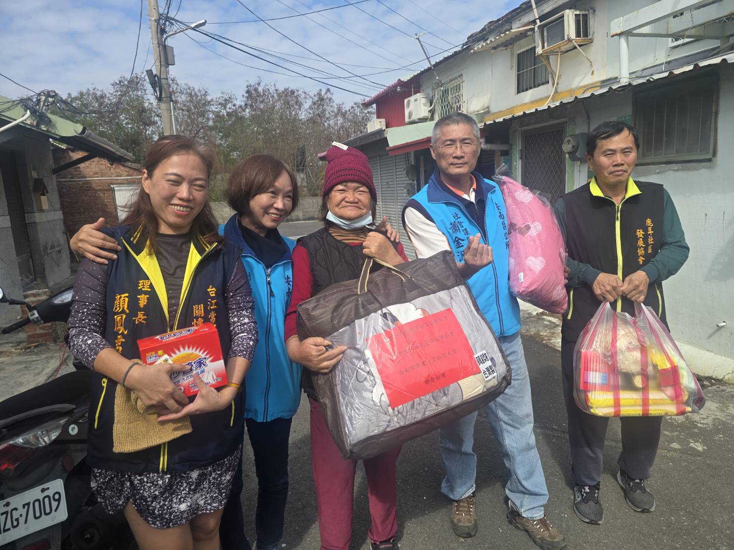 由鹿耳社區理事長蔡登進、台江常民生活關懷協會理事長顏鳳君、常備士官班校友會總幹事胡瑞忠,為社區獨居長輩購買羽絨被25套,吳碧珠女士捐贈毛帽32頂、七股九龍宮建醮捐贈民生物資一批。