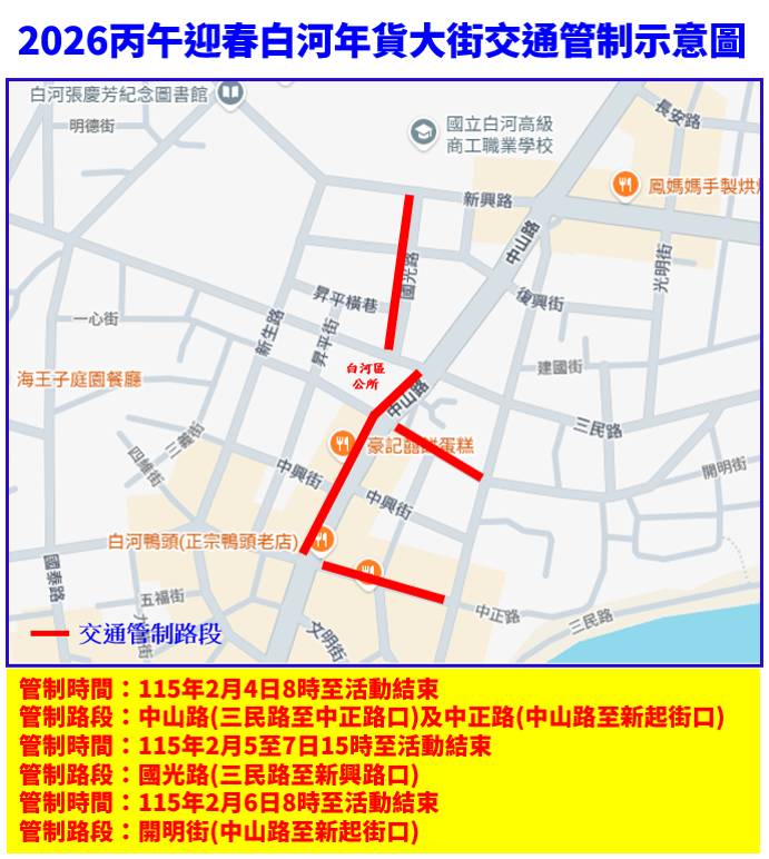 因應活動期間人潮與車流增加,白河警方將配合主辦單位實施交通管制及勤務部署,相關管制時段如下: