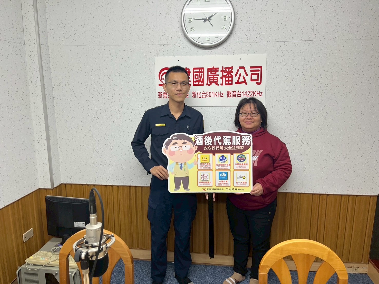 【記者邱仁武/台南報導】農曆年關將近,各企業、民間團體進入尾牙與聚餐旺季,為防制酒後駕車,白河警分局昨天特別前往「臺南線上廣播電台」及「建國電台」,透過廣播向聽眾發聲,強力呼籲:「酒後不開車,找代駕、搭小黃,平安過好年」。