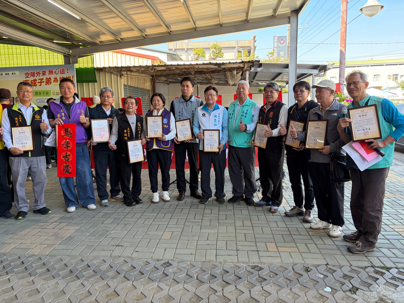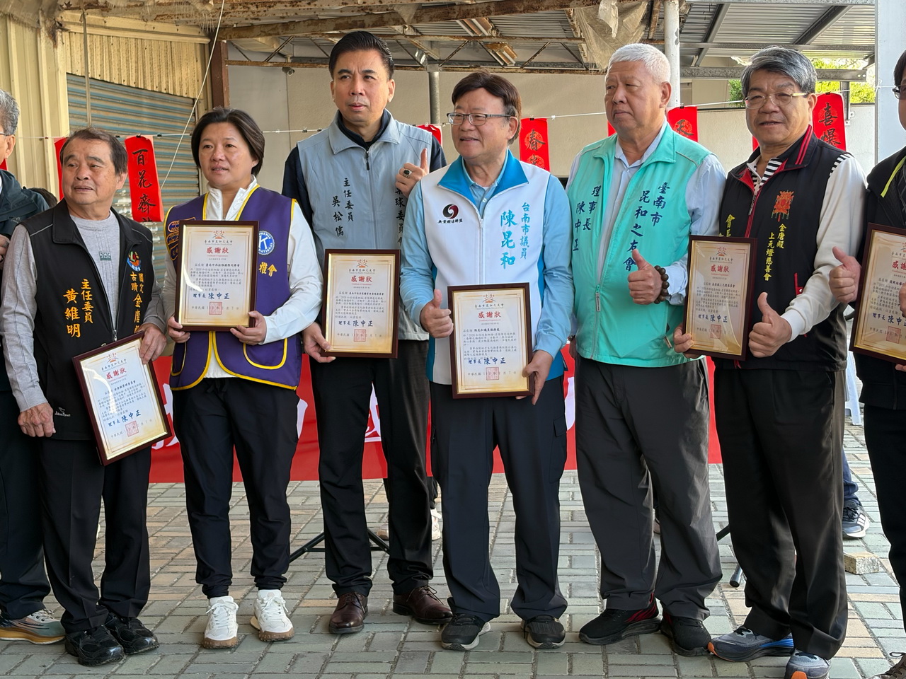 六安社區媽媽教室的表演為「2026和你迎春納福-名家現場揮毫贈春聯活動」揭開序幕,包括佳里區長林耿漢、北門區長林建男、佳里分局長謝承甫、正億棉廠董事長吳松儒、金唐殿主委黃維明、上元燈慈善會會長楊志超及佳里民防中隊中隊長陳駿逸、彼緹娃藝術蛋糕觀光工廠董事長洪佳寶等許多來賓到場,昆和之友會理事長陳中正與市議員陳昆和頒發感謝狀給協辦單位。