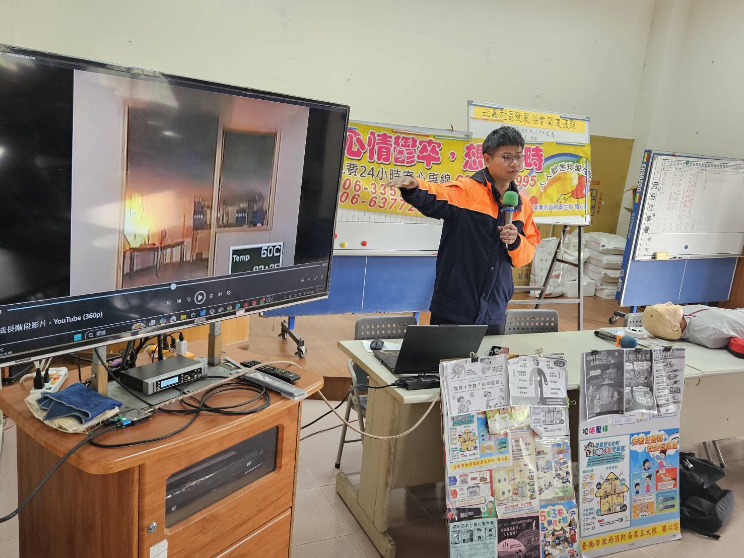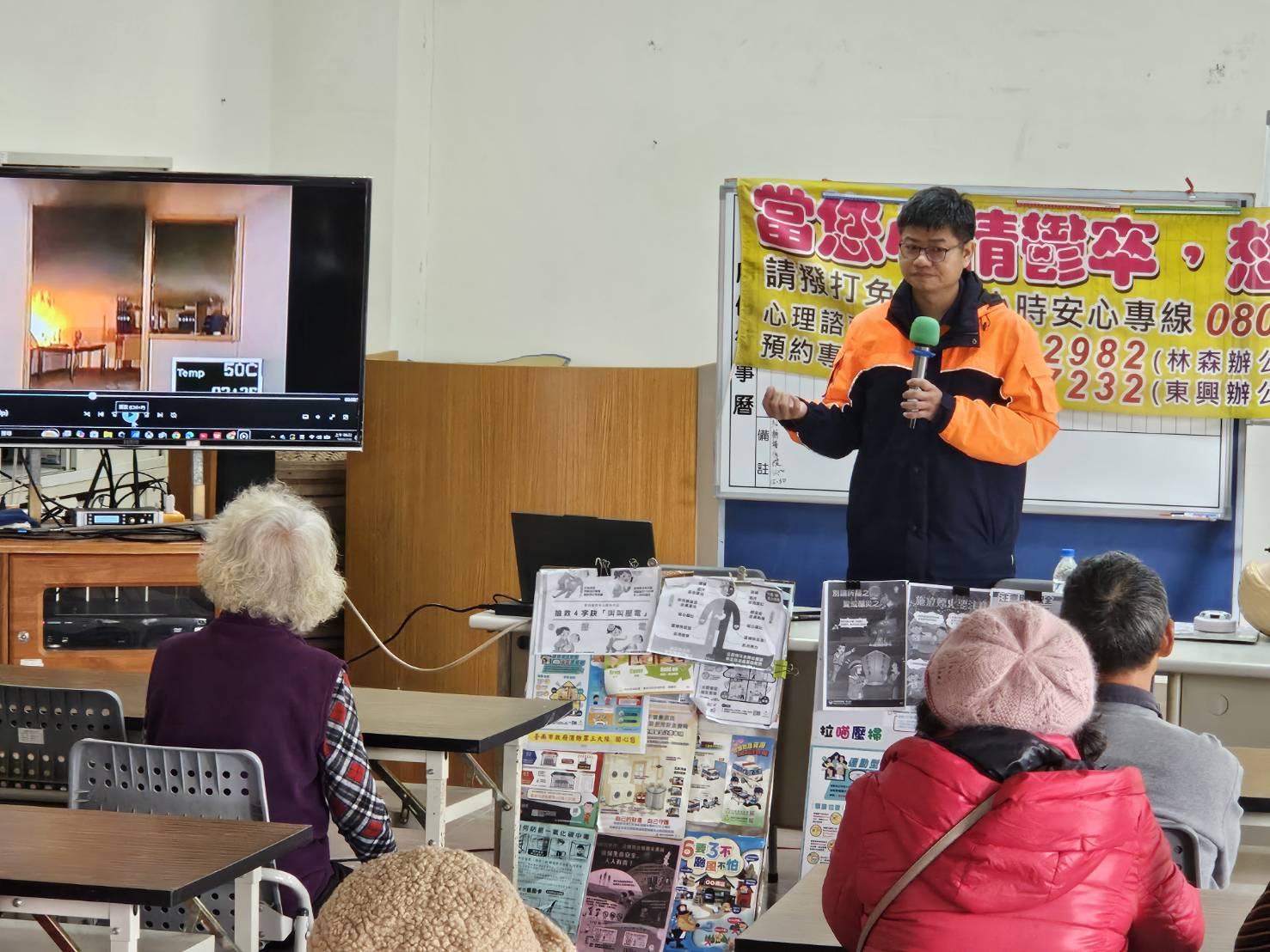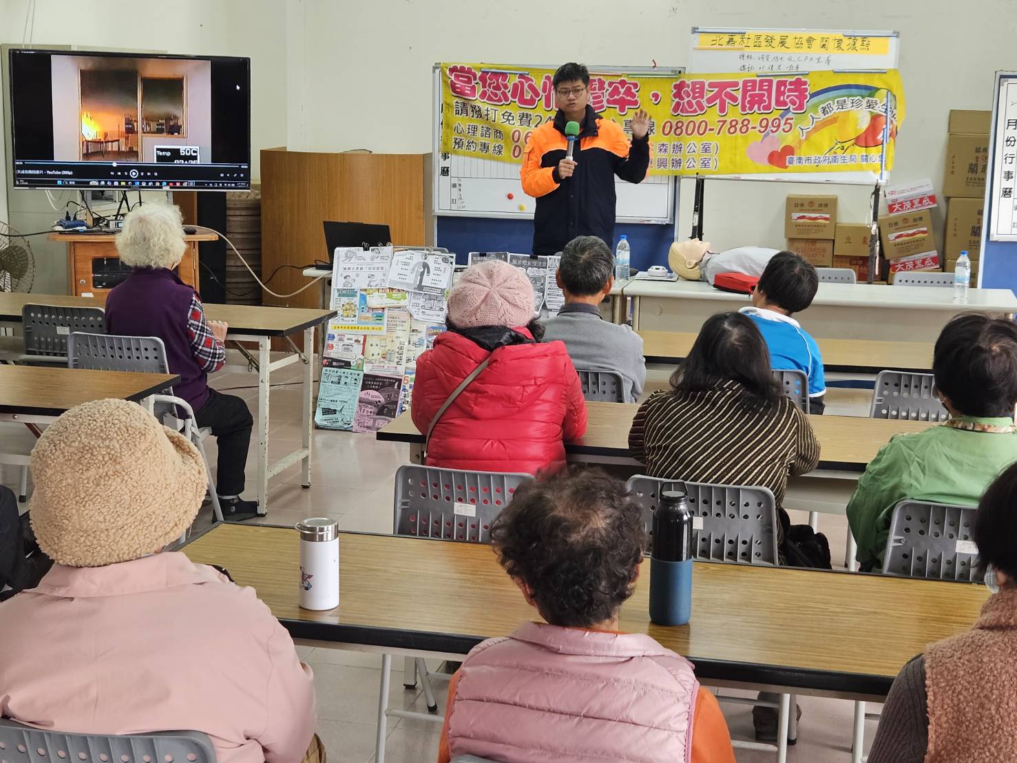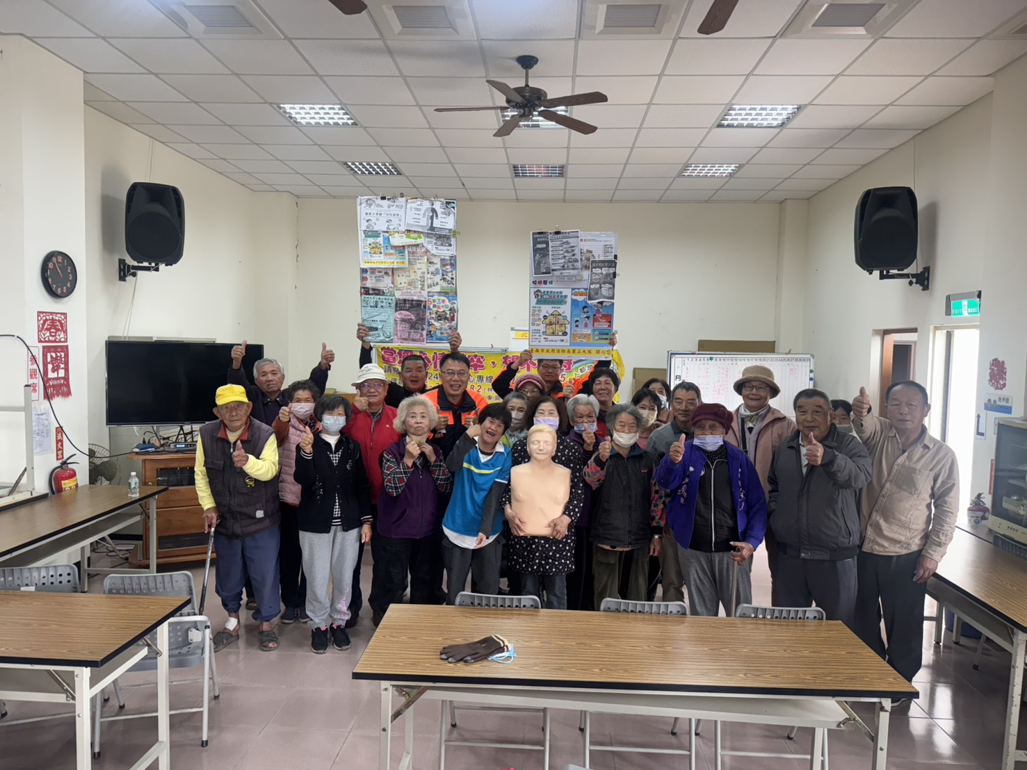 將軍分隊把握機會,今天針對北嘉活動中心現場年長者進行貼近生活的防火與救護宣導,包含住宅用火災警報器的重要性與安裝觀念、火災當下如何避難逃生講解、CPR心肺復甦術實作教學、農曆年前爆竹煙火及天燈施放注意事項,以及養成「人離火熄」的用火安全習慣。