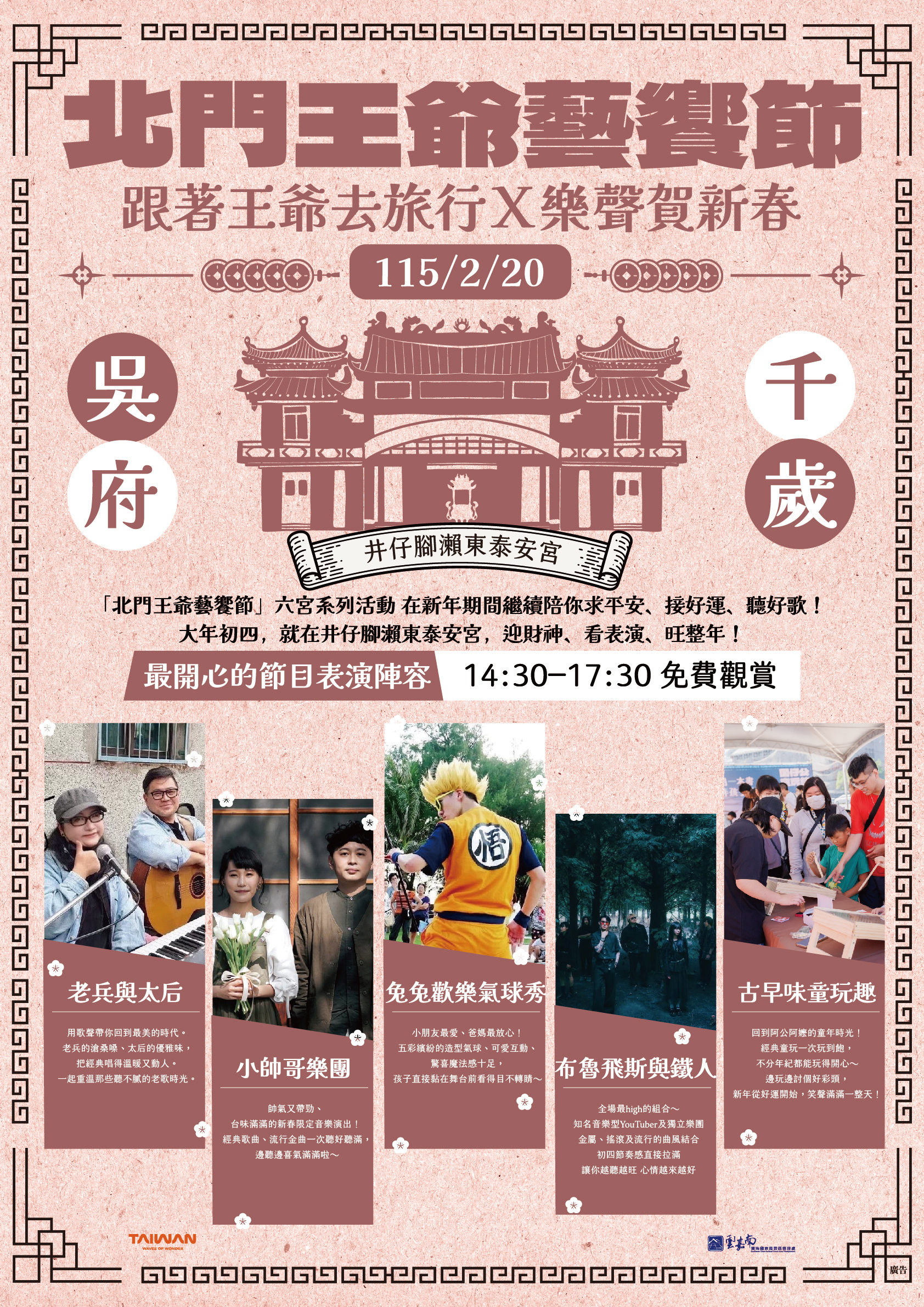 【記者邱仁武/台南報導】交通部觀光署雲嘉南濱海國家風景區管理處,配合農曆新年走春與迎財神的傳統節俗,精心策劃的「北門王爺藝饗節」系列活動,即將於大年初4(2月20日)來到北門區井仔腳瀨東泰安宮,舉辦「樂聲賀新春」主題活動!雲管處長徐振能表示,結合廟埕音樂演出、古早味童玩體驗與新春祈福儀式,邀請全國民眾在春節假期走訪北門,迎財氣、求平安,感受最具地方特色的王爺信仰文化。