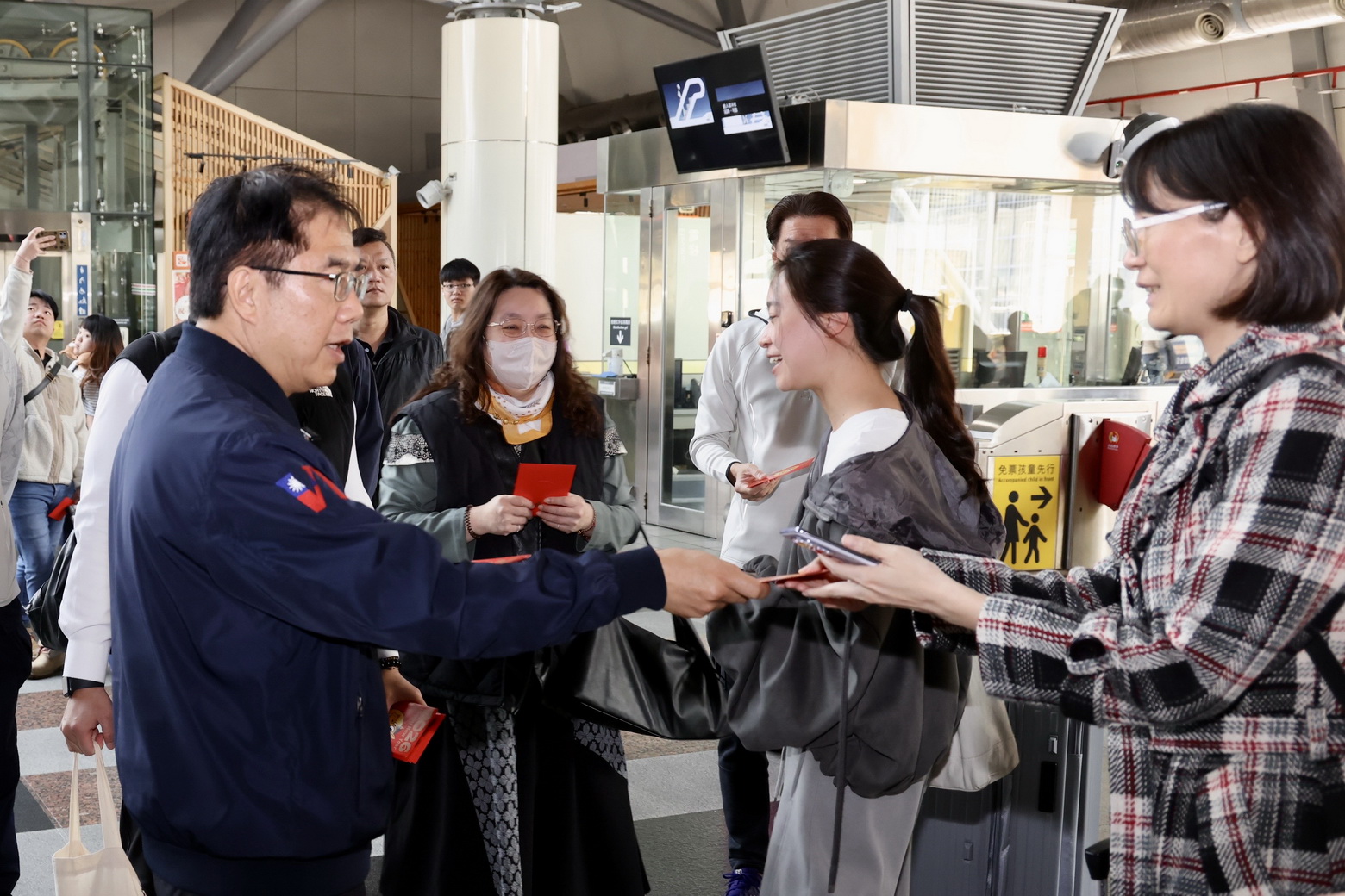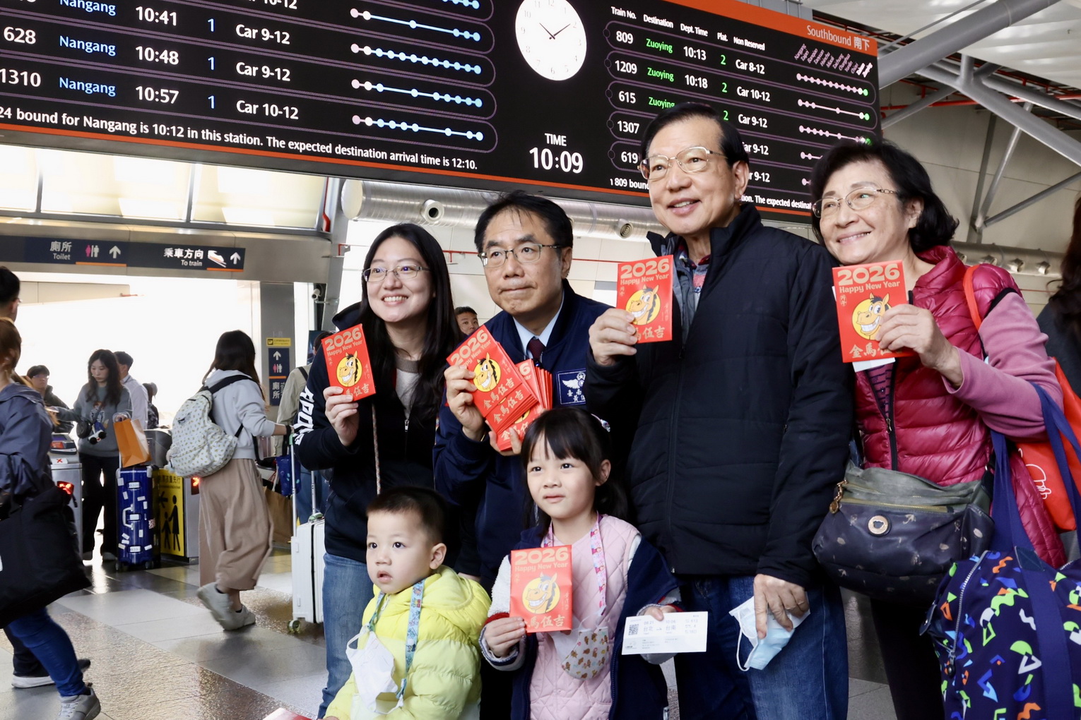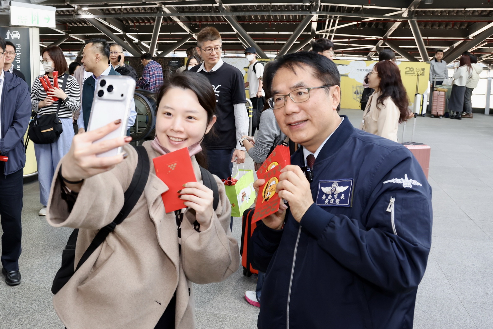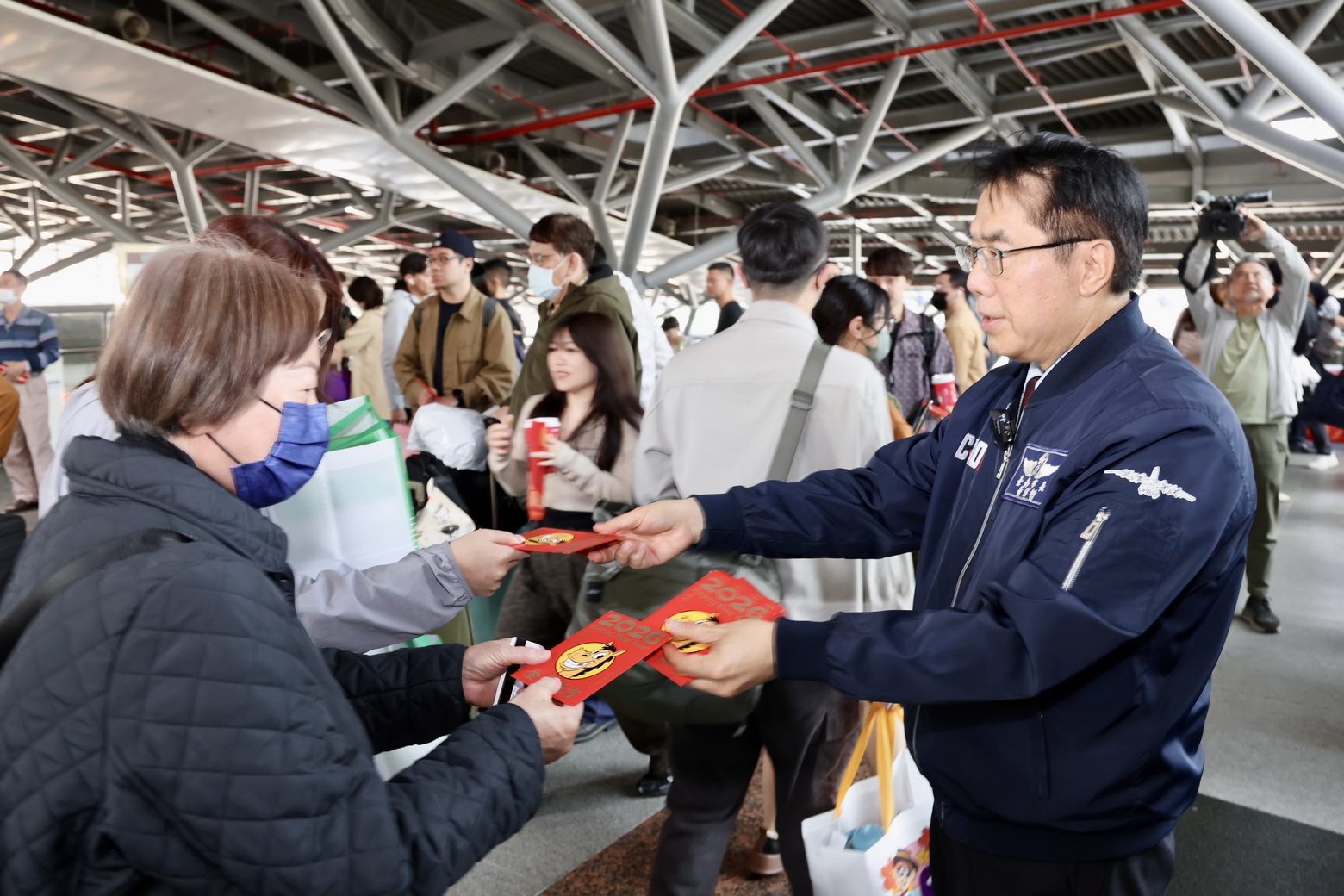 【記者邱仁武/台南報導】農曆春節9天連假首日,台南市長黃偉哲今(14)日前往高鐵台南站及台鐵台南站視察旅運情形,並向返鄉市民及旅客發送「金馬伍吉」春聯與紅包,現場氣氛熱絡。適逢西洋情人節,黃偉哲也祝福大家情人節快樂,同時提醒返鄉與出遊民眾,多加利用大眾運輸工具,減少塞車與尋找車位的時間,讓行程更順暢。