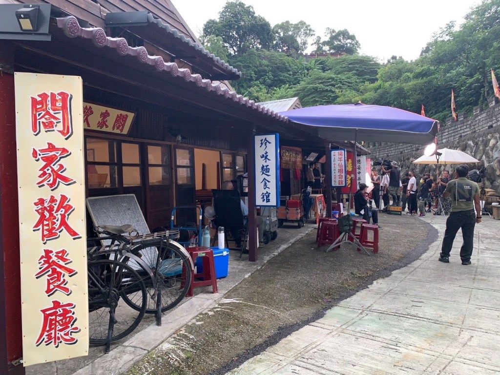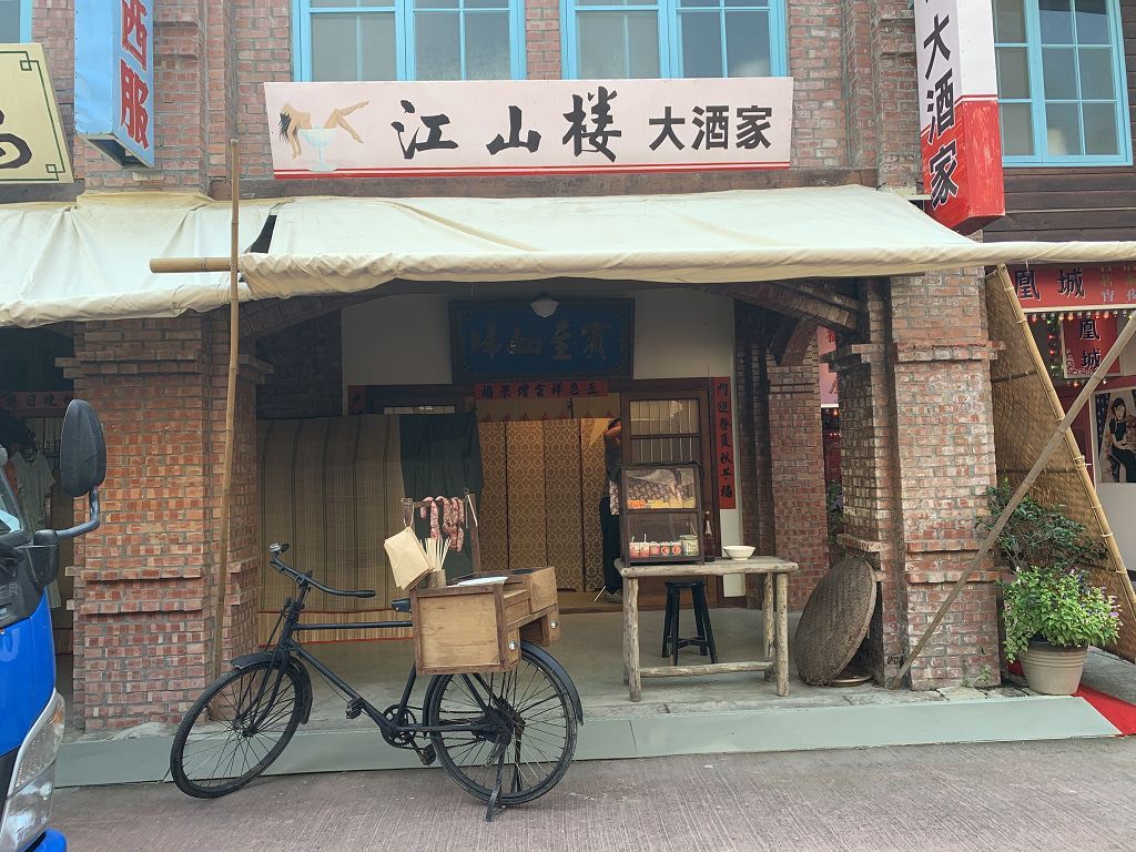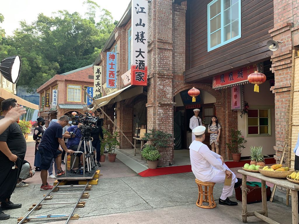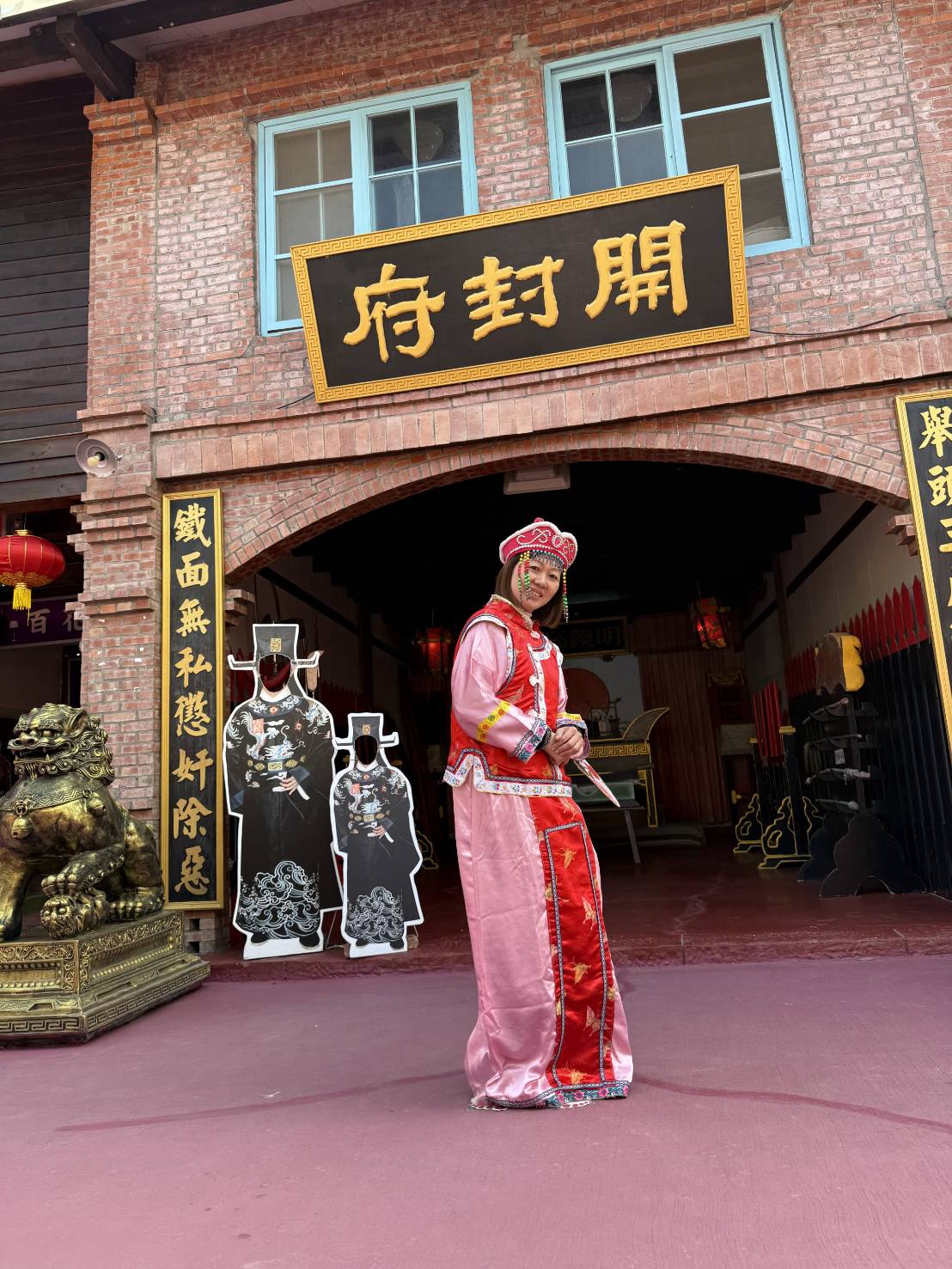 直行而入,便來到園區最熱鬧的電影老街區。紅磚瓦礫鋪陳街道風貌,酒家、開封府、龍門客棧、御膳房等主題場景一字排開,濃濃古裝電影氛圍撲面而來。布袋戲場景旁寫著「導演自己當」,邀請遊客即興登台,圓一場戲劇夢。