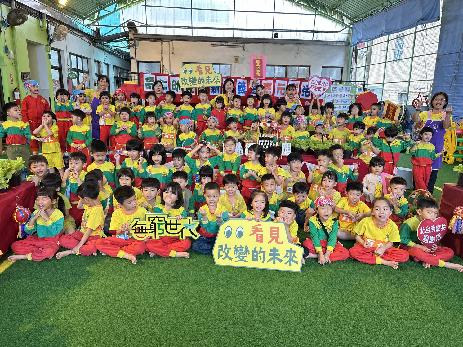 台南歸仁區育仁幼兒園已是第四年響應北台南家扶無窮世代義賣,3日一早在園長許惠淨帶領下,全校300名師生一起動員,小朋友的身影忙碌地穿梭在校園,分工合作忙著摘菜和佈置義賣攤位,準備下午於校門口販售親手栽種的無毒蔬菜、自製的茶樹清潔液、玩具手錶和襪子,期待社會大眾共同響應家扶迎新春無窮義賣活動,幫助弱勢家庭脫離醫療困境,看見改變的未來!
