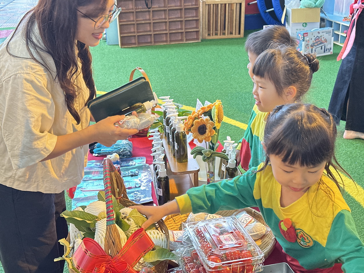園長許惠淨得知家扶每年都會舉辧無窮世代義賣活動,全校師生都極力支持愛心義賣活動,並將園內的蔬菜拿來義賣,從栽種、採收、包裝上架和義賣,都是小朋友自己來,成就感滿滿,另有師生齊力製作天然茶樹清潔液,以及熱心家長捐贈的玩具手錶和襪子,期透過小朋友的愛心傳遞邀請民眾做公益為開春討好采頭!