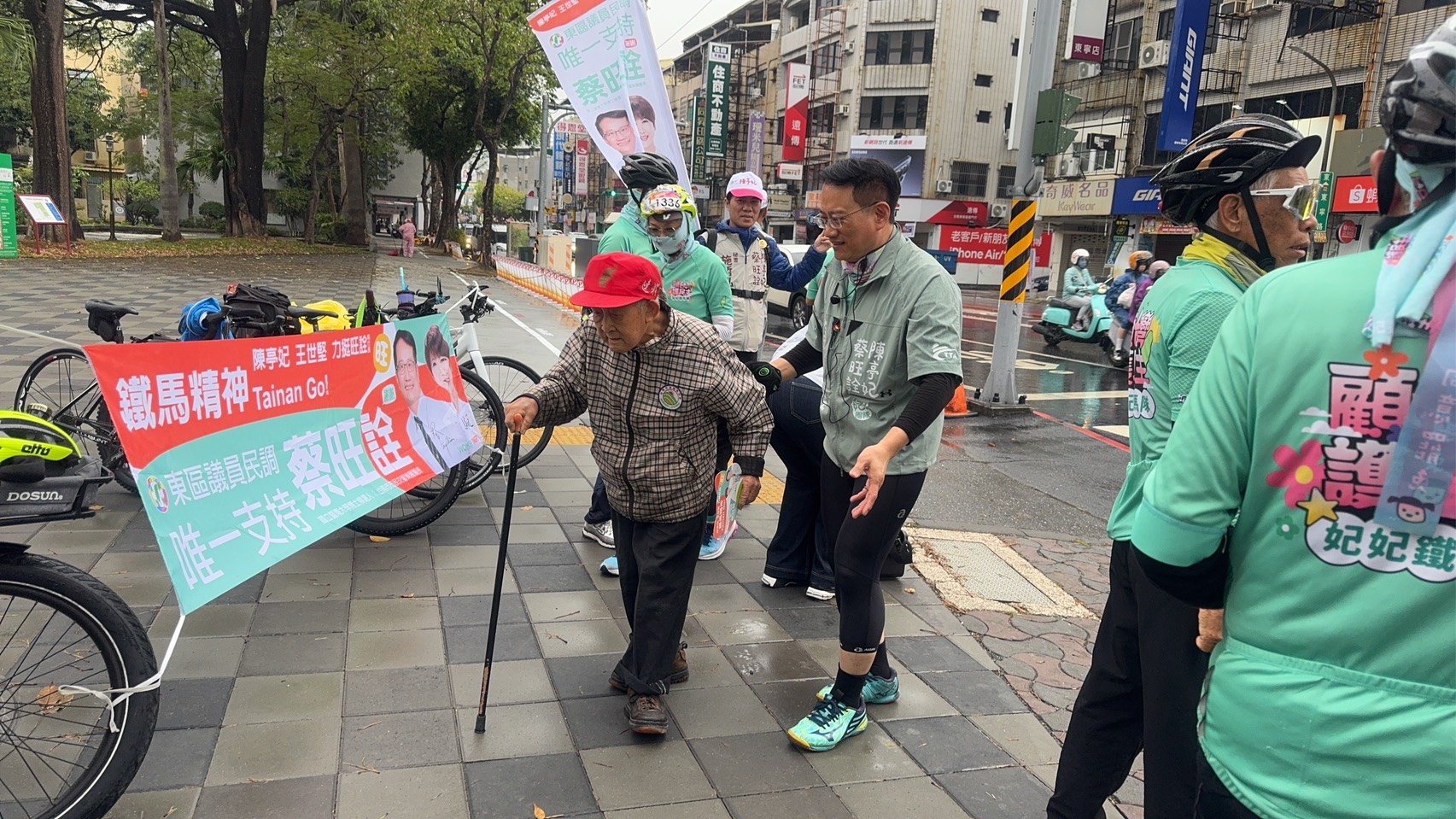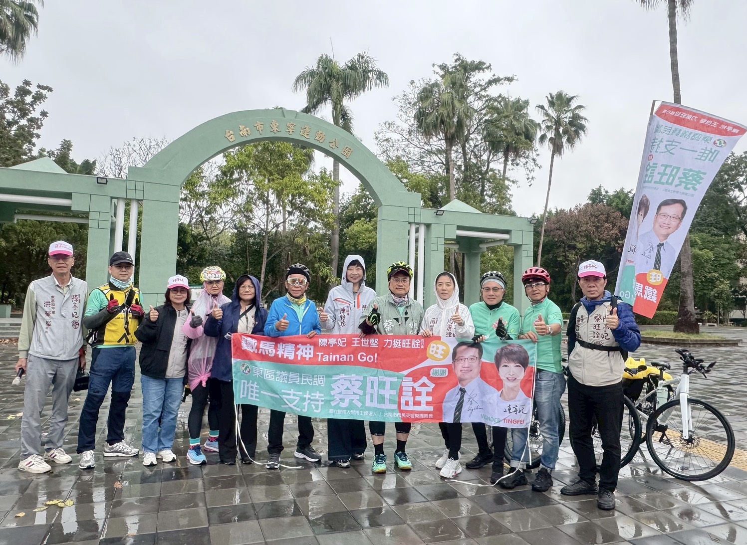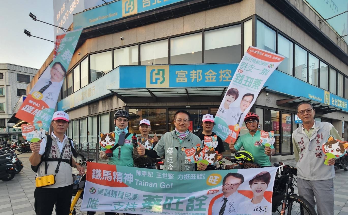 選戰倒數階段,蔡旺詮每天率「妃妃鐵馬隊」穿梭大街小巷,以騎乘腳踏車方式拜訪鄰里、走訪市場、站路口向市民揮手致意,展現「一步一腳印」的鐵馬精神。