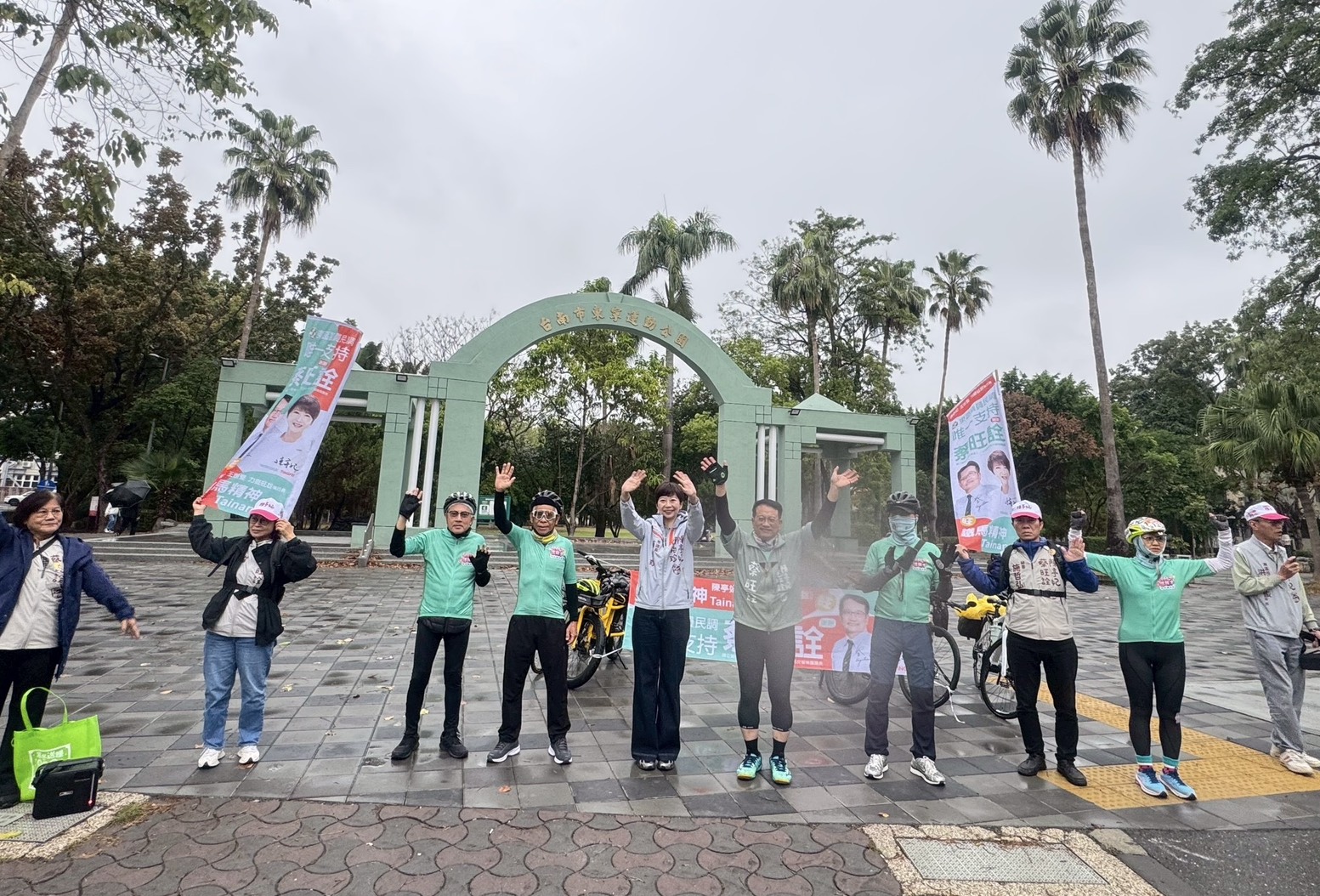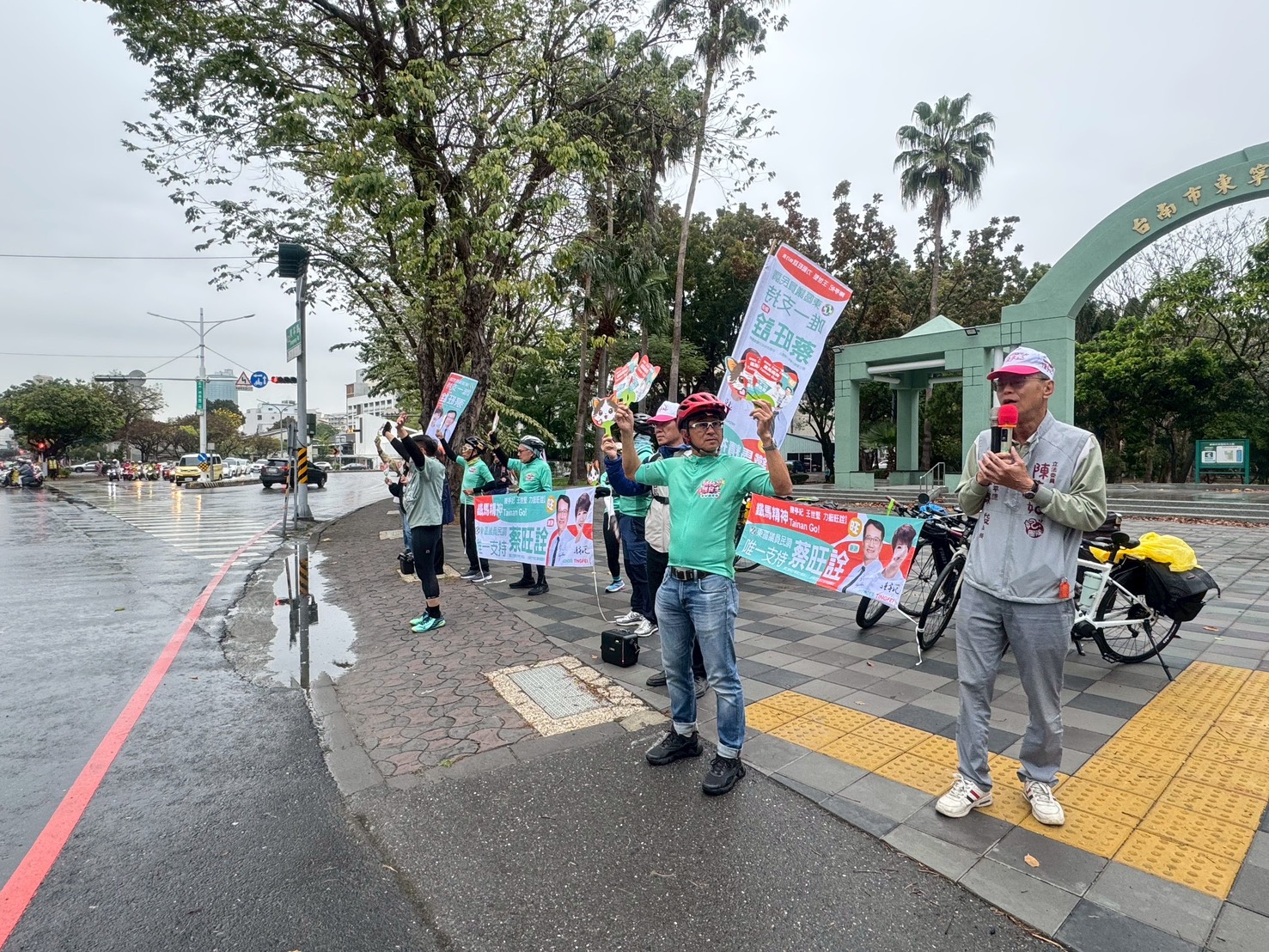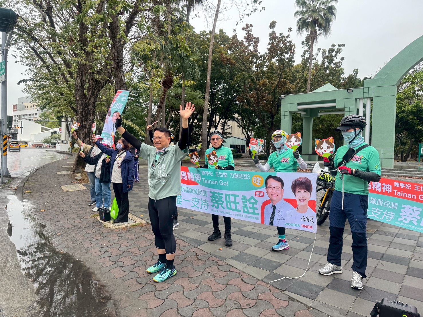 3月4日清晨,即便天候不佳,仍在東寧公園向通勤騎士揮手問候,爭取市民支持。包括議會同仁陳怡珍、周麗津等人,也冒雨到場力挺,展現團結氣勢。