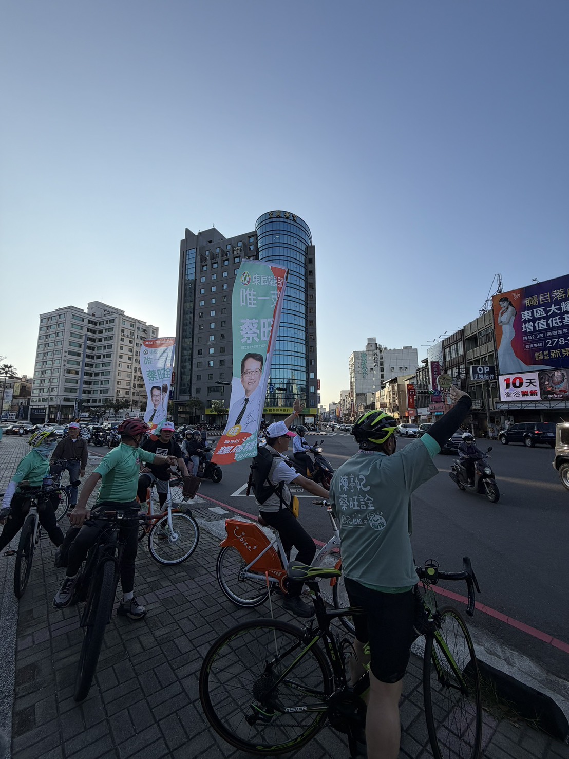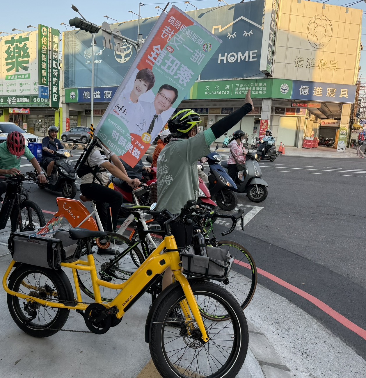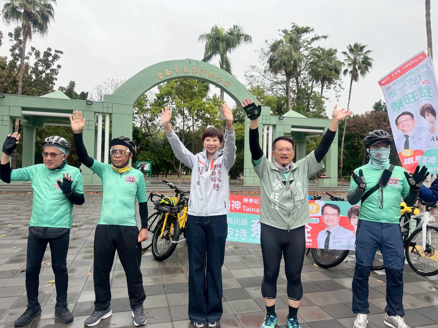 3月4日清晨,即便天候不佳,仍在東寧公園向通勤騎士揮手問候,爭取市民支持。包括議會同仁陳怡珍、周麗津等人,也冒雨到場力挺,展現團結氣勢。