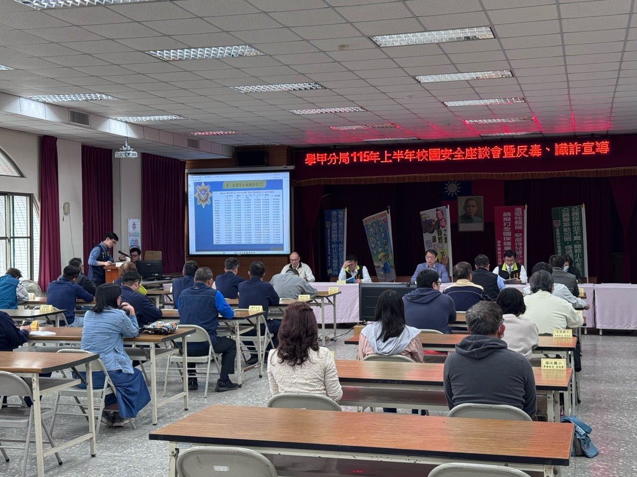 【記者邱仁武/台南報導】台南市政府警察局學甲分局,為打造地區學童安心的學習環境,並防制毒品入侵校園,保護學童避免遭受詐騙,昨天邀請轄內區公所、各級學校代表、里長,以及分局各業務、外勤單位,召開「115年上半年校園安全座談會暨反毒、識詐宣導」,分局長林明俊期許利用面對面座談方式,共同研商校園安全議題並提出適當之解決方案。