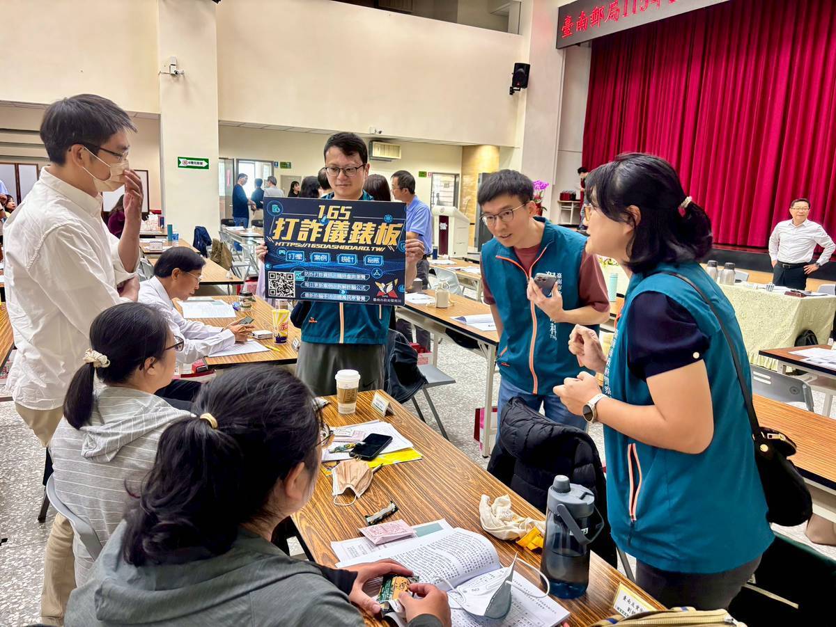 警察局到場參與反詐騙宣導活動的宣導團成員,由台南市政府警察局局長林國清率犯罪預防科科長李忠憲、行政科科長朱恩銳、刑警大隊技正葉景星及第五分局行政組組長黃俊程等員警到場設攤作反詐騙及阻詐常識、阻詐成功案例分享與宣導「無聲簡訊QRCode報案機制」,鼓勵郵政人員可於發現疑似詐騙民眾時以無聲掃碼簡訊,由轄區員警接手協助,避免阻詐工作可能衍生的糾紛與衝突,郵警雙方互動熱烈,宣導效果良好。