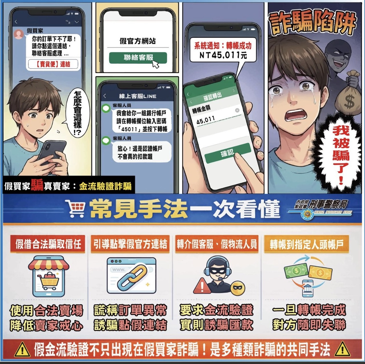 假買家、假客服詐騙!小心多重金流陷阱 詐騙集團鎖定在臉書、IG、Dcard等社群平台販售商品的賣家,主動私訊表示欲購買,並以「交易保障」為由,要求賣家透過超商或物流平台建立交易連結。 隨後再謊稱訂單異常,誘導賣家點擊假客服連結,最終騙取銀行轉帳QR code或信用卡OTP驗證碼,導致資金遭盜領或盜刷。 防詐提醒: 請使用官方平台交易,勿點擊陌生連結 對「實名驗證、金流簽署」提高警覺 不提供任何OTP驗證碼、QR code或銀行資料