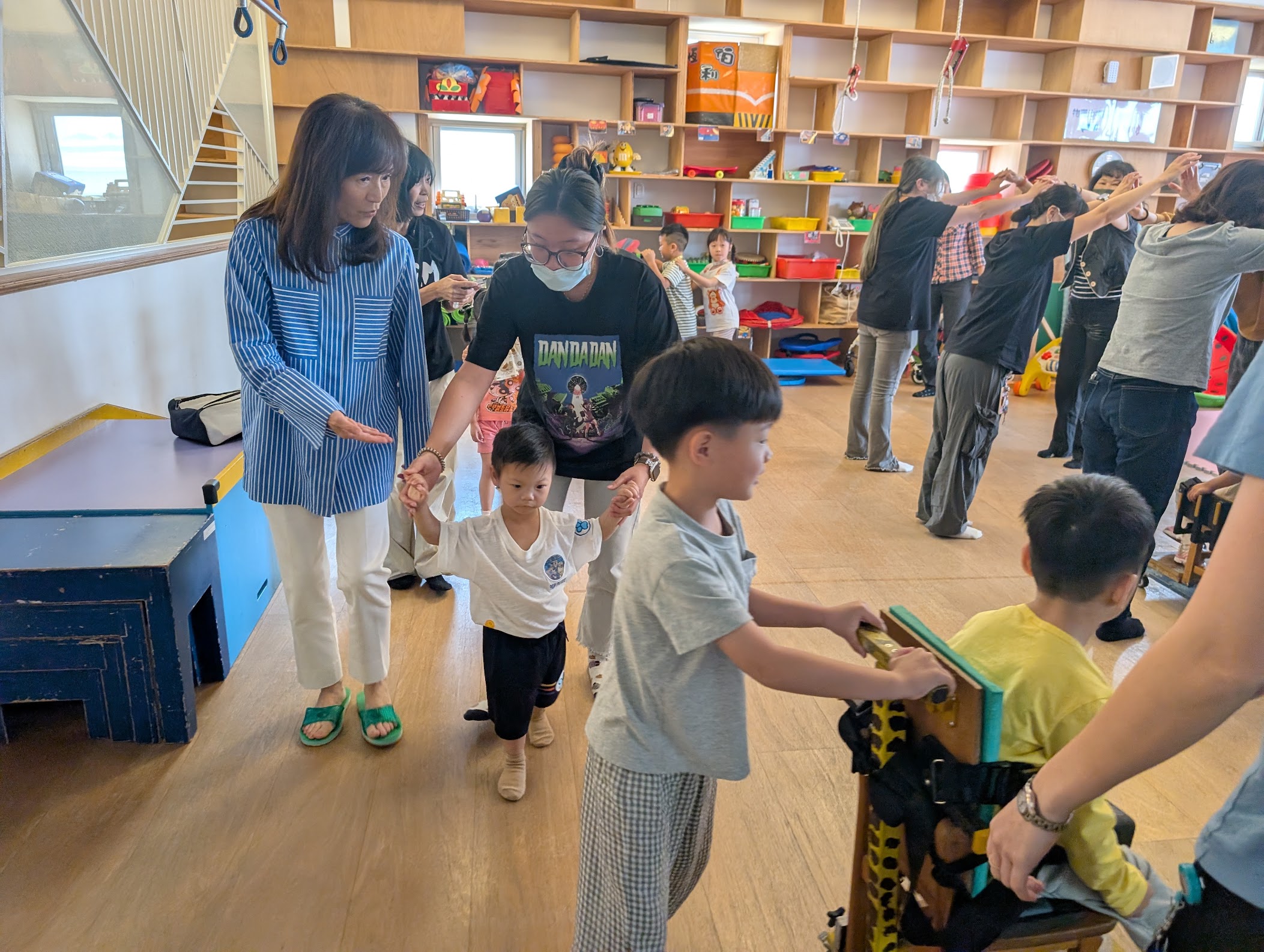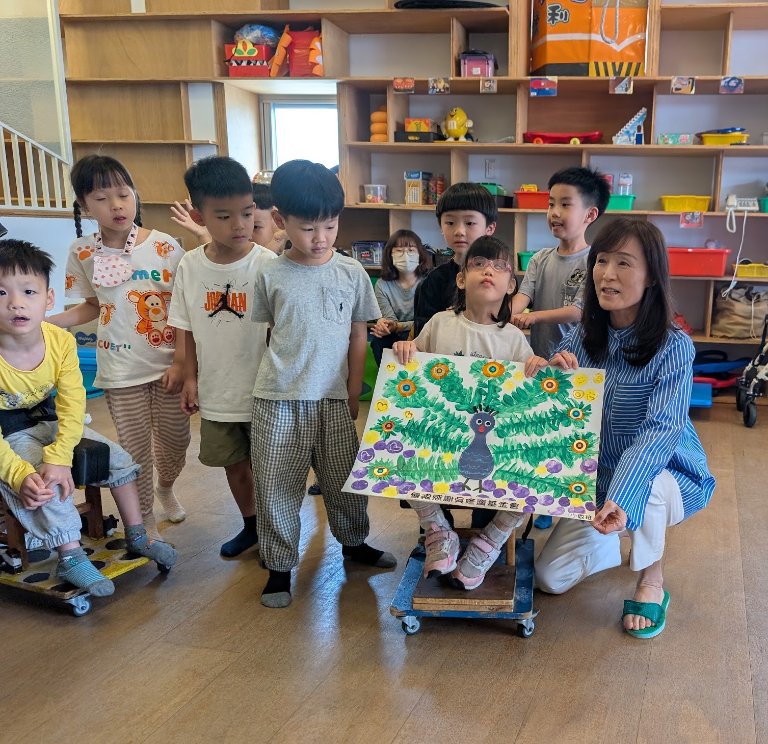 曾任成功大學校長的董事長蘇慧貞展現親和力,在欣賞幼兒表演之餘,也親自參與互動,陪伴孩子們進行「火車過山洞」遊戲,笑聲不斷,拉近彼此距離。楊明井董事亦與師生親切交流,關心孩子學習與成長。小鹿班幼兒致贈手作孔雀開屏畫作表達感謝,並以童言童語分享「有車車就可以去幫助更多小朋友」,純真話語令人動容。
