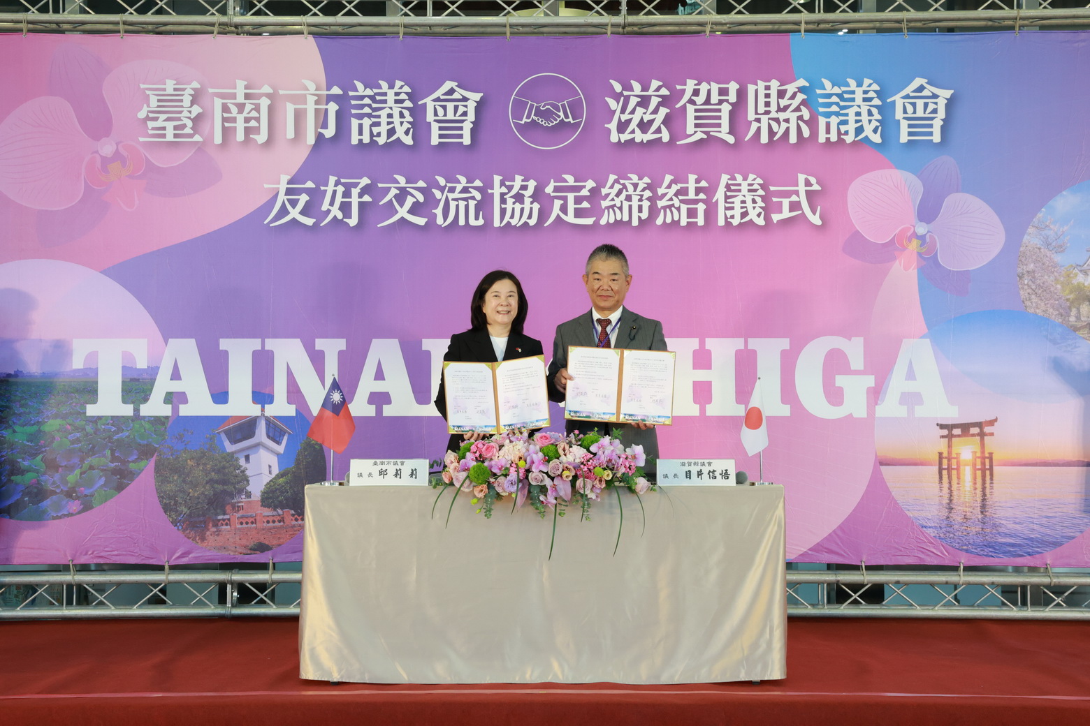 【記者邱仁武/台南報導】臺南市與日本滋賀縣自2013年簽署經濟交流備忘錄以來,雙方互動頻繁、成果豐碩。臺南市議會與日本滋賀縣議會昨天正式簽署友好交流協定,象徵兩地在長期友好基礎上,邁入更緊密的合作新階段。簽署儀式由臺南市議會議長邱莉莉與滋賀縣議會議長目片信悟共同完成,現場氣氛隆重而溫馨。