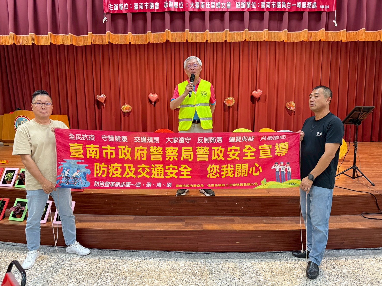 佳里分局巡佐許智惠及偵查佐吳哲維宣導推動反貪腐廉政作為及反詐騙案例,台南市政府警察局路老師李晟邦警官在會場加強宣導「請勿行駛路肩及變換車道請打方向燈提醒用路人」的重要性,避免違規受罰及確保用路人安全。呼籲養成酒後勿開車,行人落實慢、看、停,駕駛用路人行經路口停、看、聽,以策安全。