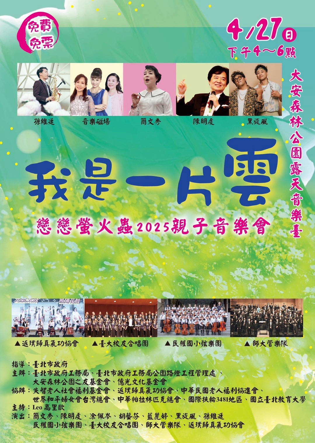 【記者陳駿彰/綜合報導】四月螢火蟲季到了,臺北市政府工務局暨公園路燈工程管理處、大安森林公園之友基金會及億光文化基金會將於4/27(週日)下午4點在大安森林公園舉辦「我是一片雲」親子音樂會,為大家帶來快樂的溫馨午後!