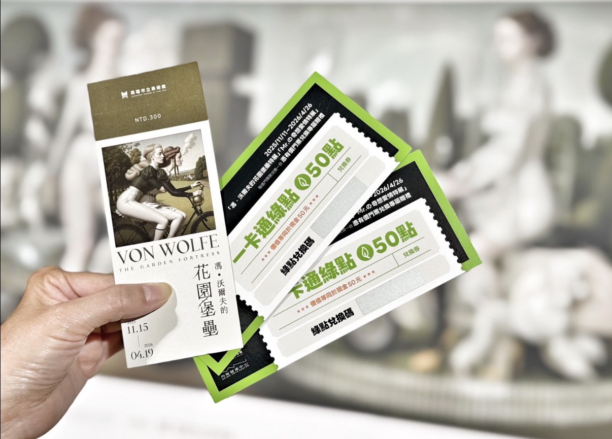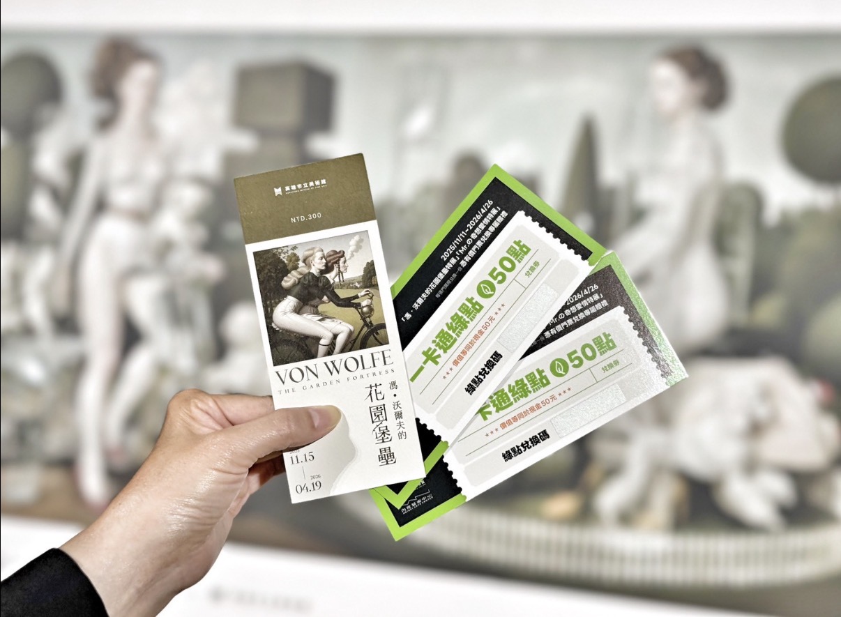 愛護地球即刻行動, iPASS一卡通與高美館攜手鼓勵民眾支持本次「藝術低碳永續行動」,改搭乘大眾運輸前往欣賞國際級藝術特展,自2025年11月11日起,於《馮.沃爾夫的花園堡壘》及《Mr.の奇想愛情》特展期間,憑兩特展有價門票可分別至高雄市立美術館1F服務中心及內惟藝術中心服務櫃台,每人每張門票可兌換「一卡通綠點50點」兌換券乙張,每iPASSMONEY帳號限領兩組序號,數量有限,兌完為止。一卡通綠點1點價值等於1元,可折抵一卡通記名卡及iPASS MONEY乘車碼交通搭乘金、生活繳費或超商綠色通路消費,請民眾多改搭乘大眾運輸前往觀展,支持藝術低碳永續行動。