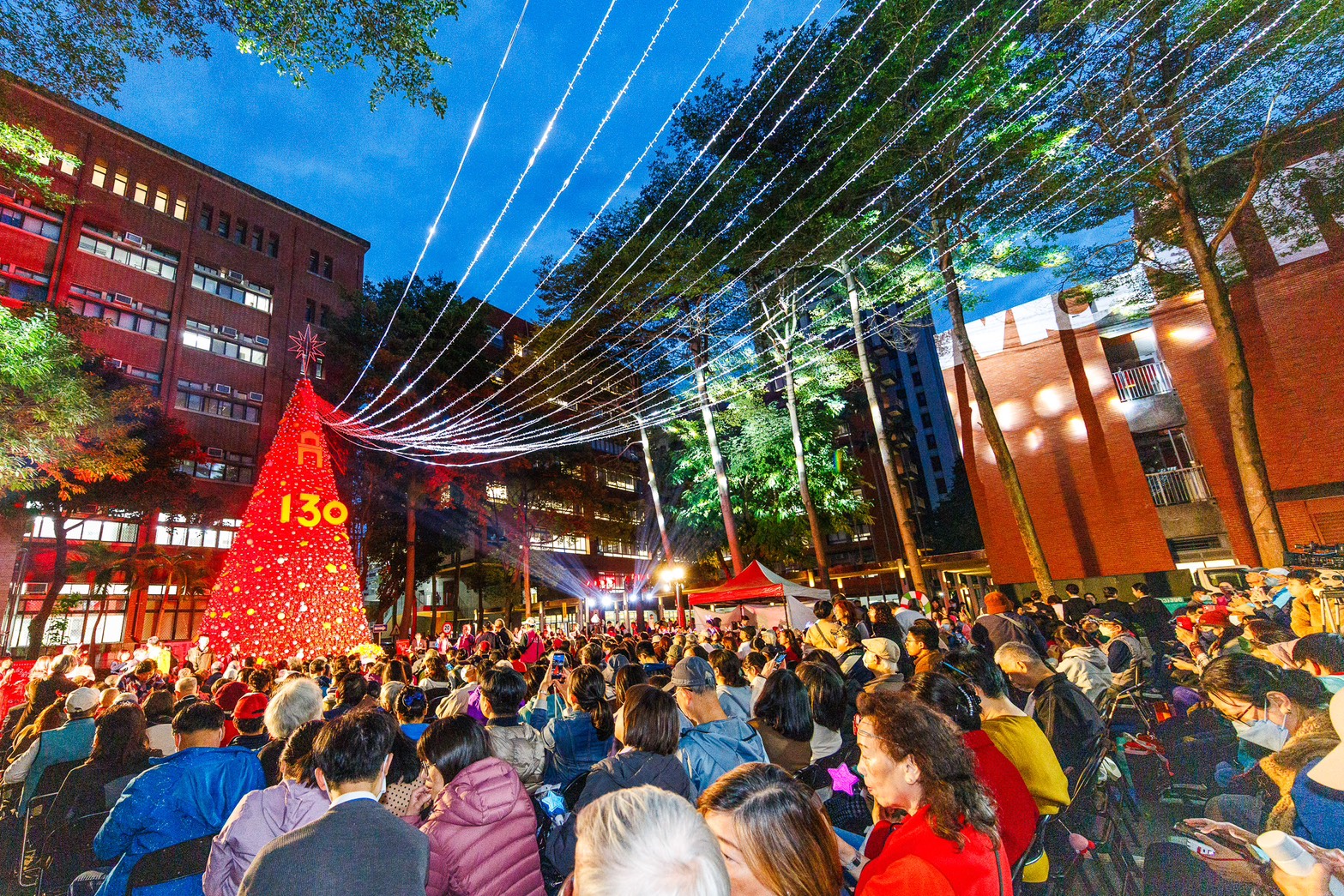 這次點燈主題曲〈向前走〉,特別邀請開心男團黑旋風演唱,他們自然隨性的原住民律動與活力真是難得一見,與來賓的活潑互動更是掀起高潮,象徵著對國北教大130週年邁向國際、迎向美好未來的前景!點燈祈福的貴賓有:教育部常務次長朱俊彰、國北教大校長陳慶和、校友總會理事長粘舜權、億光電子董事長葉寅夫、行天宮志業公益會會長黃忠臣、佛教慈濟慈善事業基金會執行長顏博文、天主教台北聖家堂神父饒志成、松山慈惠堂總策劃長李瑞彬、中華國際嘎檔巴佛教總會慧吉祥、馬偕醫院安寧療護創辦人賴允亮、日本無量光院台灣別院住持融永、芳欣教育基金會執行長謝汶欣、名人堂建築師簡俊卿等,帶領全場齊聲倒數啟動點燈祈福,聖誕樹瞬間綻放萬丈光芒,華麗呈現,現場驚呼驚艷連連!來賓們揮舞著星星棒交織成一片星海,共同見證這個充滿愛與溫暖的時刻,最後齊唱〈平安夜〉,祝福彼此圓滿順遂!