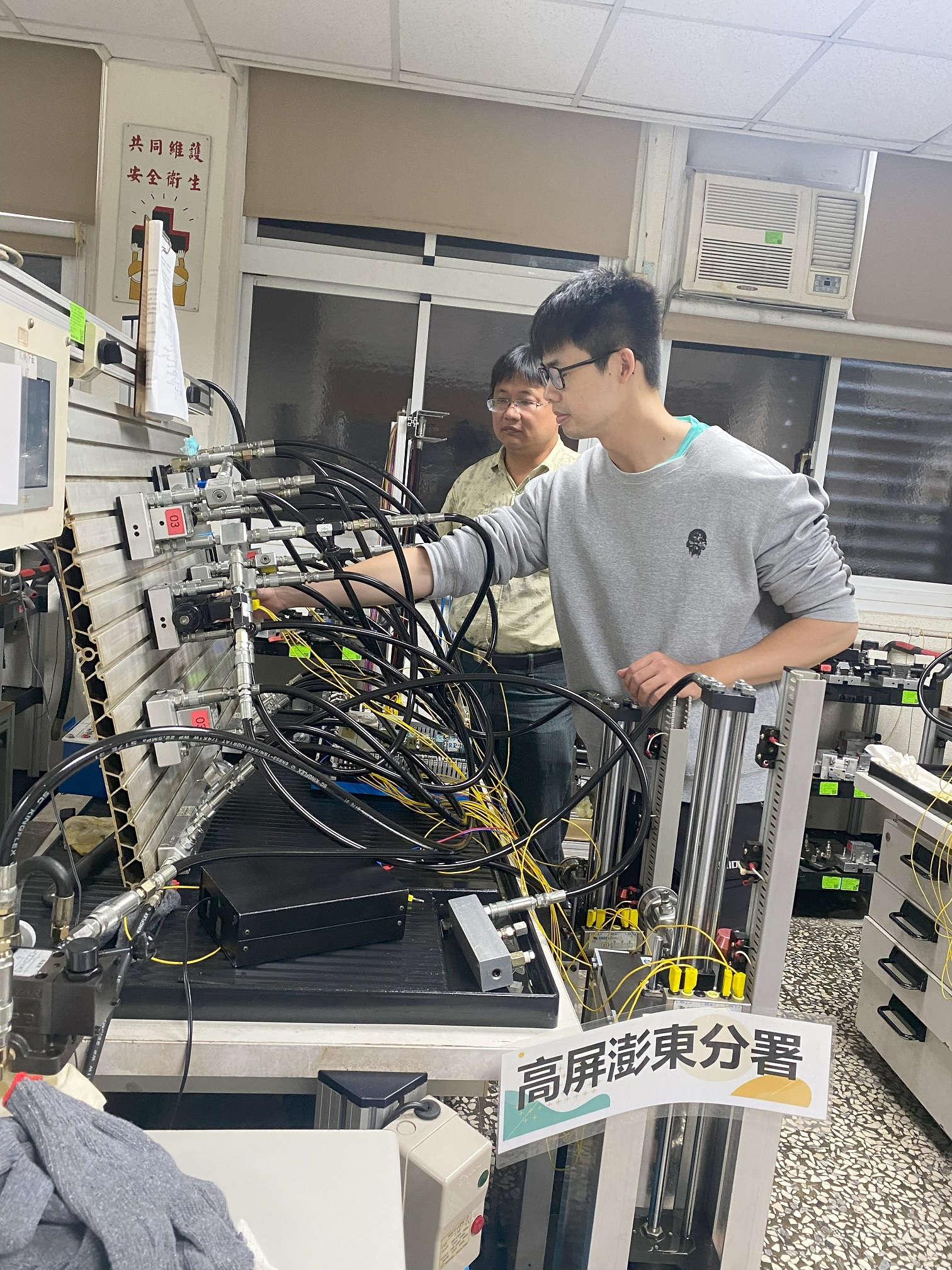 (上圖:老師指導陳俞成(右一)進行機電控制實務操作。)
