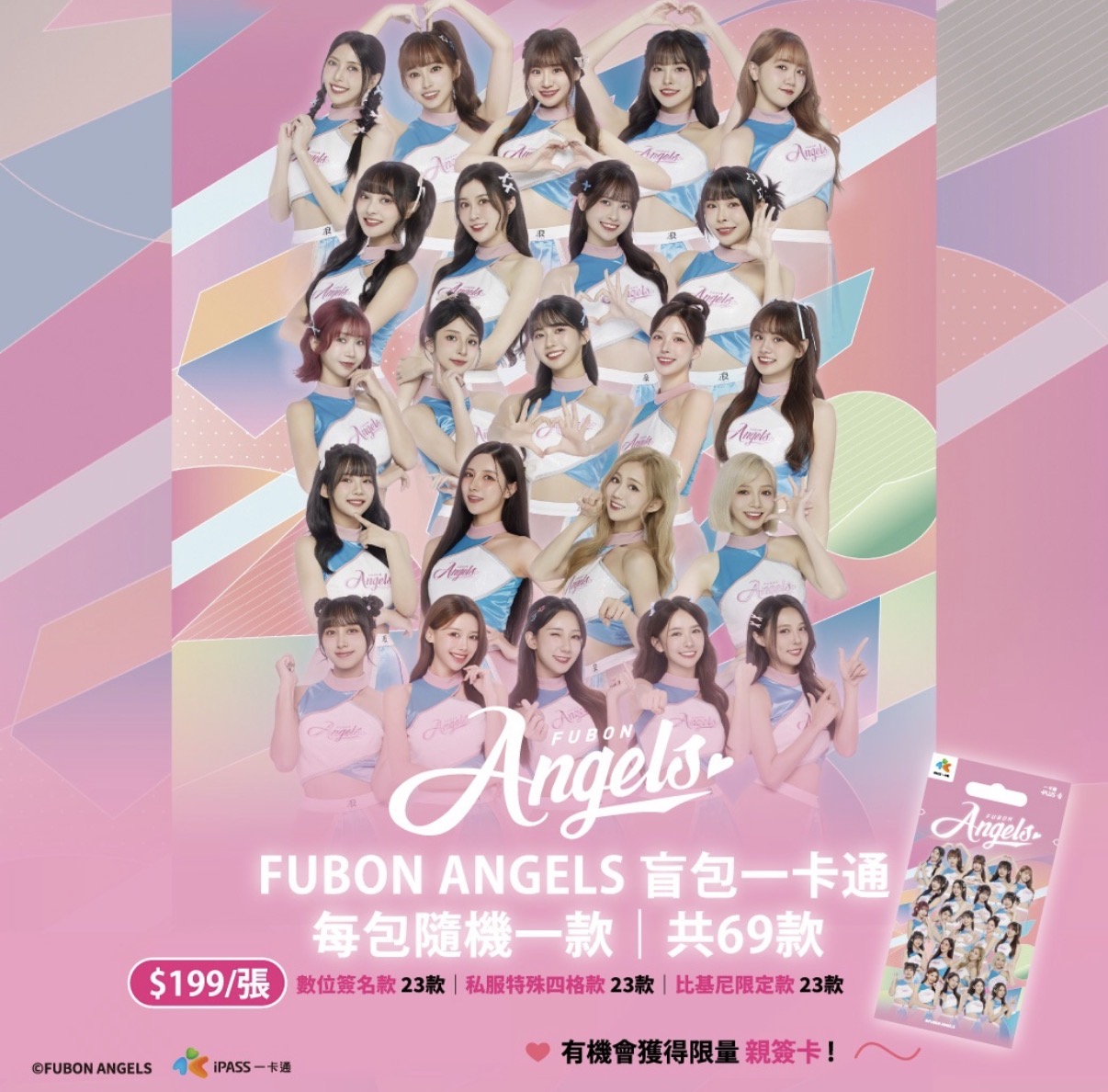 台灣棒球應援文化揚名國際,啦啦隊更是球場上最亮眼的焦點,iPASS一卡通與富邦悍將啦啦隊聯名,推出「FUBON ANGELS 一卡通」系列盲包,集結寶兒、禾羽、奶昔、Kesha、潔潔、丹丹、潔米、Tiffany、秀秀子、安娜、卡洛琳、李雅英、慈妹、Kapo、李皓禎、大頭、Jessy、雅惟、維心、栗子、沁沁、南珉貞、檸檬等 23 位成員,將於 2 月 10 日起在全台 7-ELEVEN販售,球迷們千萬別錯過。
